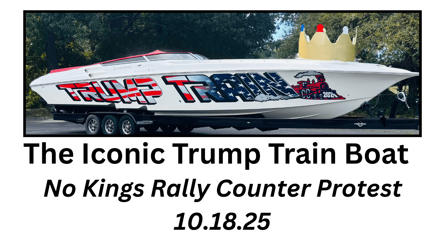 We answer by blasting the horn louder, flying the crown higher, and rolling the Trump Train Boat straight through their rage. Because the day they tried to silence President Trump with a bullet and murdered Charlie Kirk with a sniper’s shot, fear died, the First Amendment ignited, and a handful of defiant patriots rose to counter-protest louder, bolder, and forever, declaring with one voice: We won’t be silenced.”