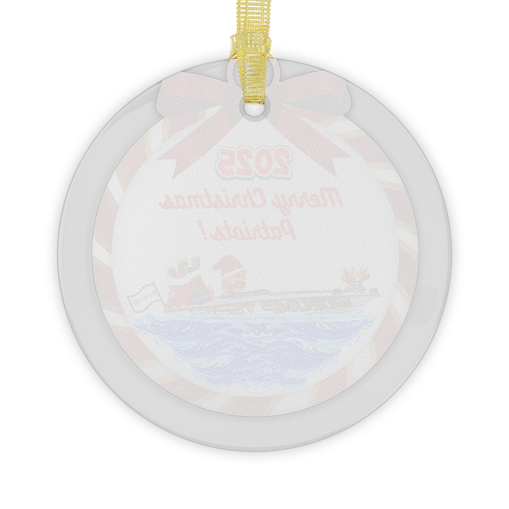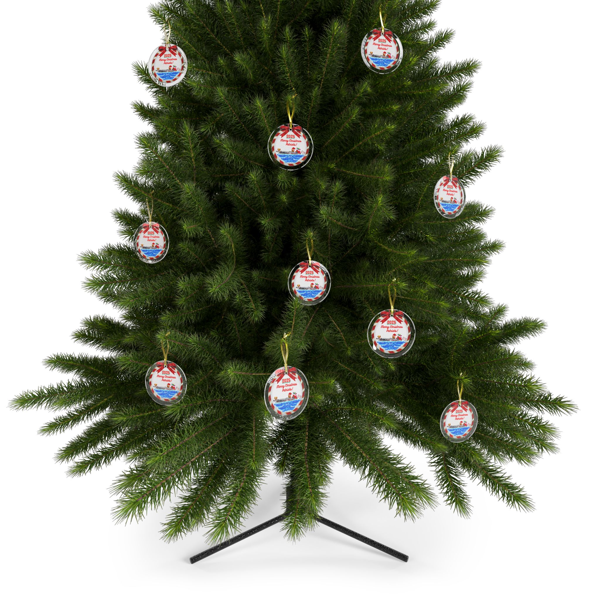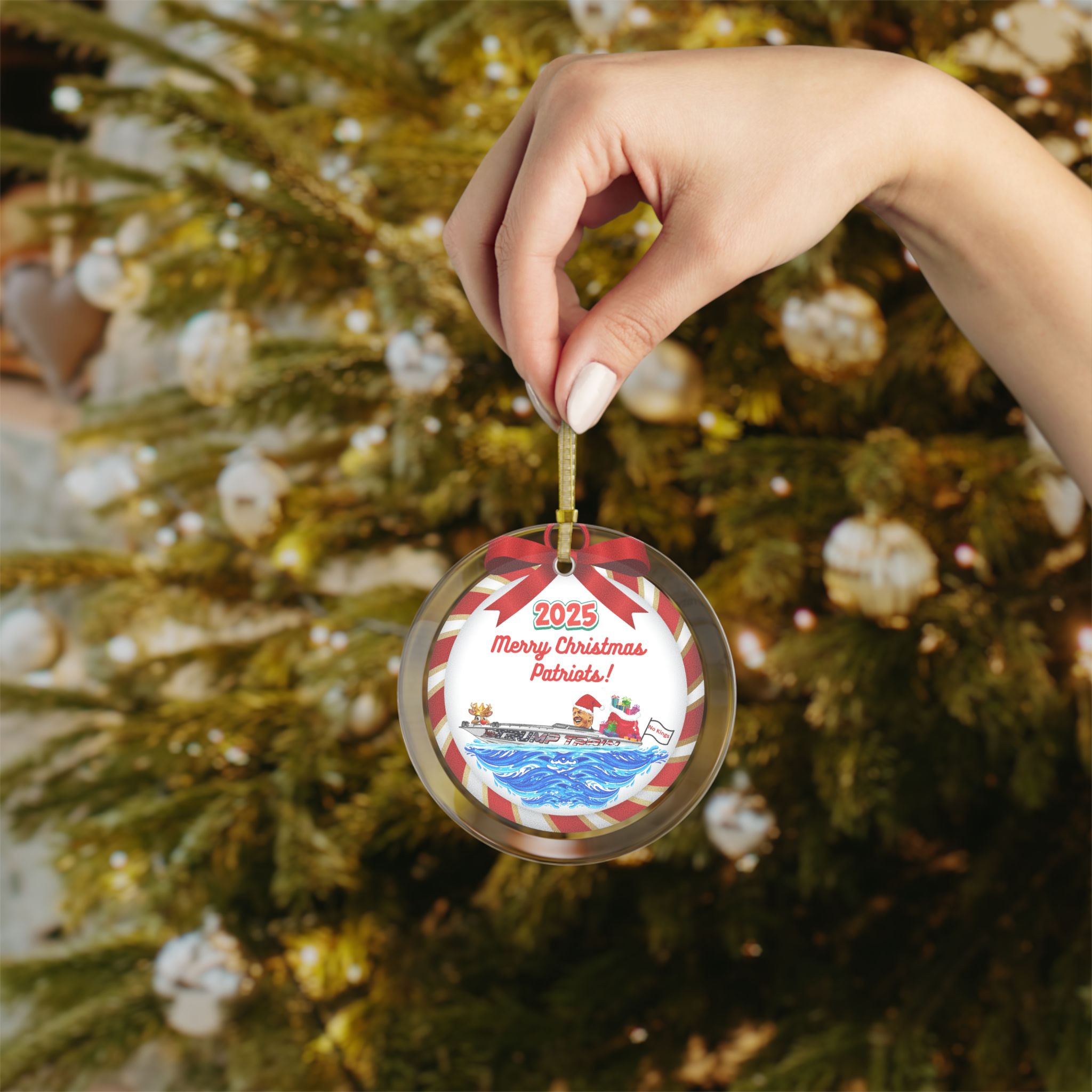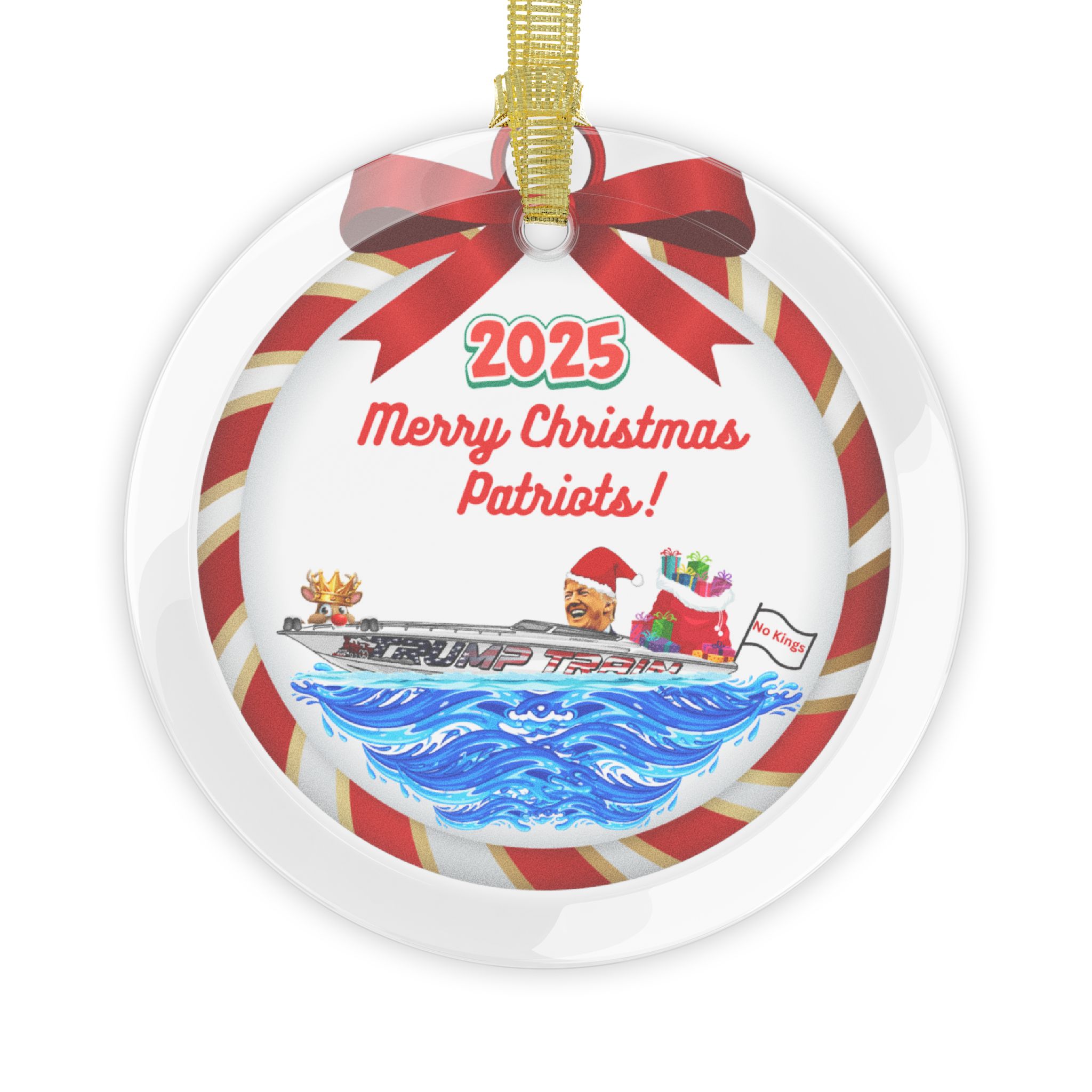 Hold onto your stockings! This stunning glass ornament is a glittering masterpiece of merry mischief, boldly proclaiming "Merry Christmas Patriots!" while Trump Santa commandeers the Trump Train Boat like a jolly juggernaut, sack of gifts bulging bigger than his poll numbers.