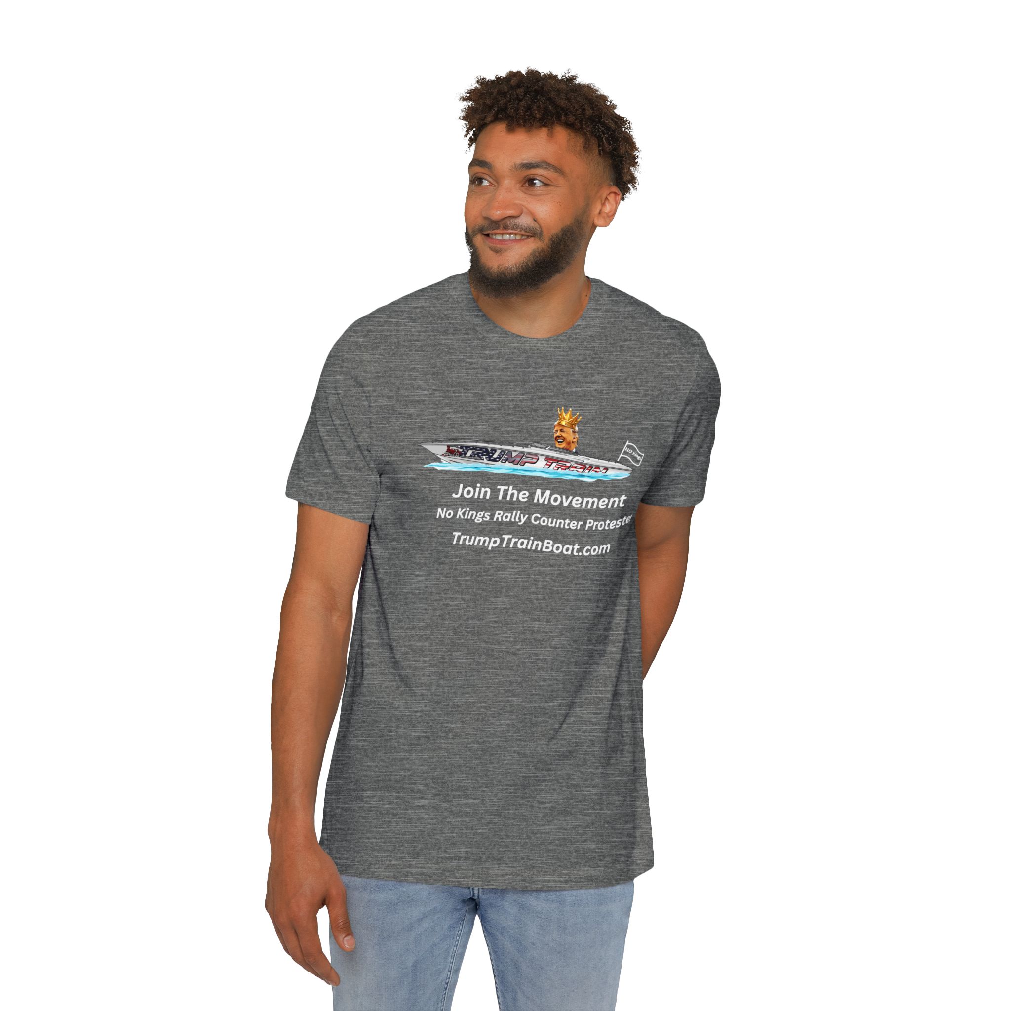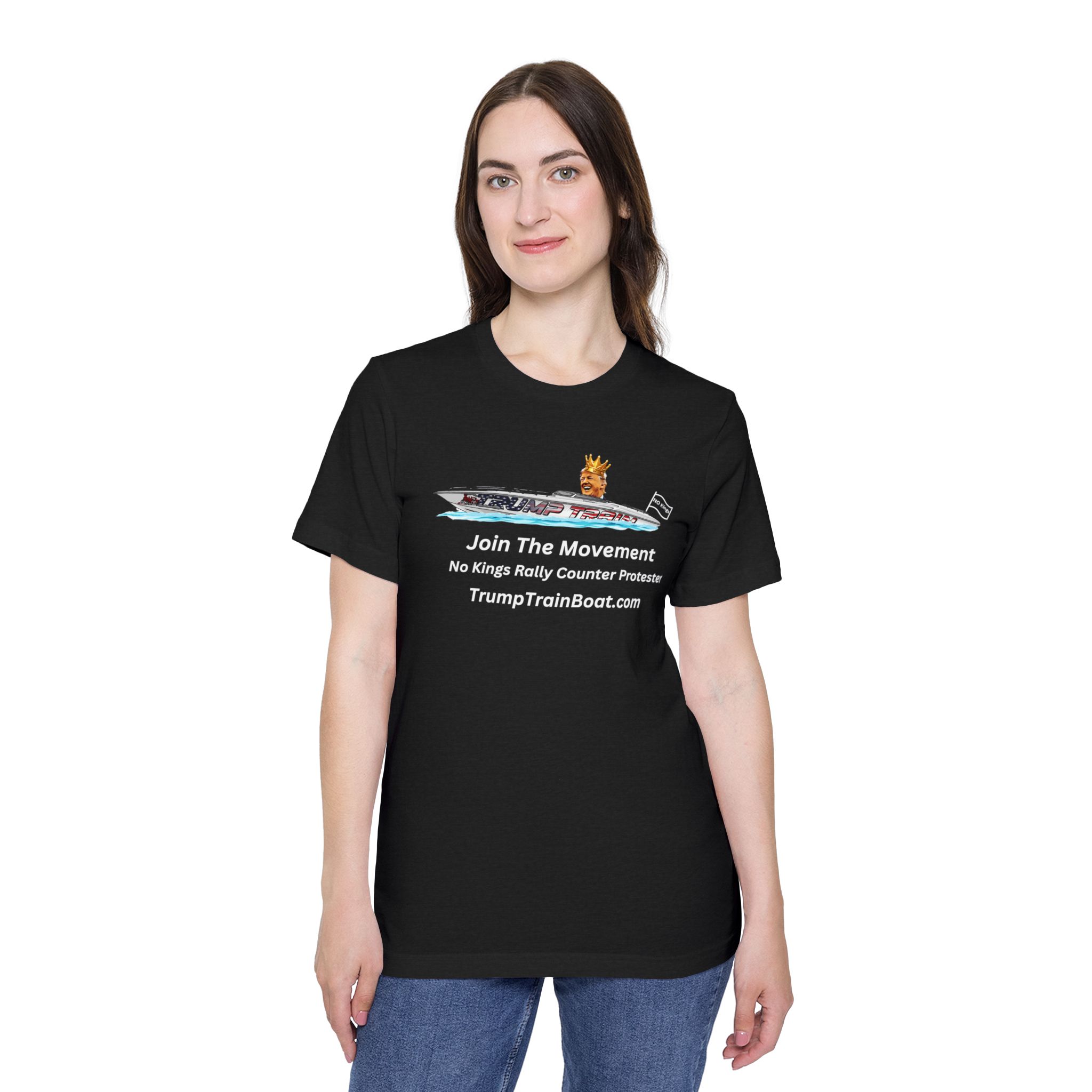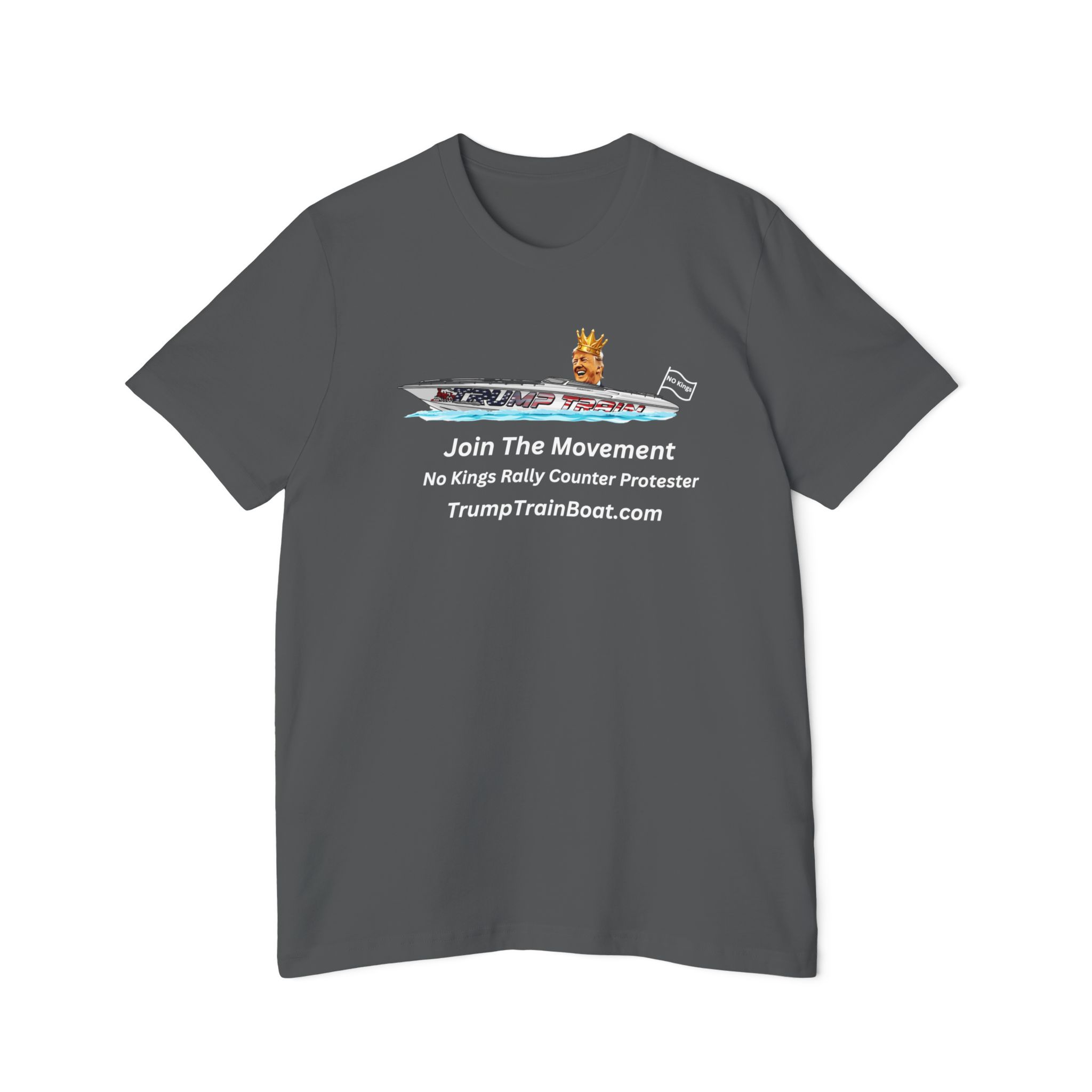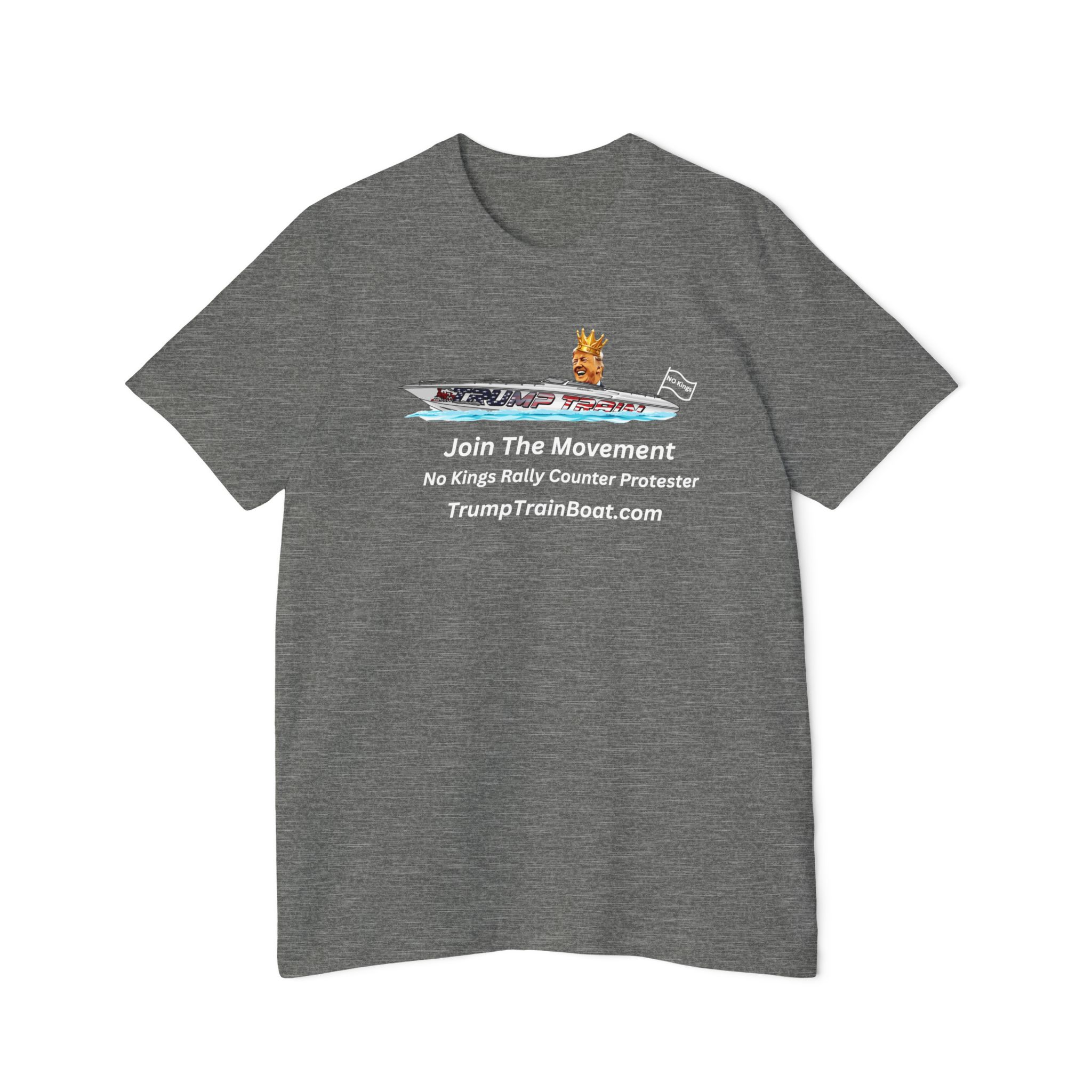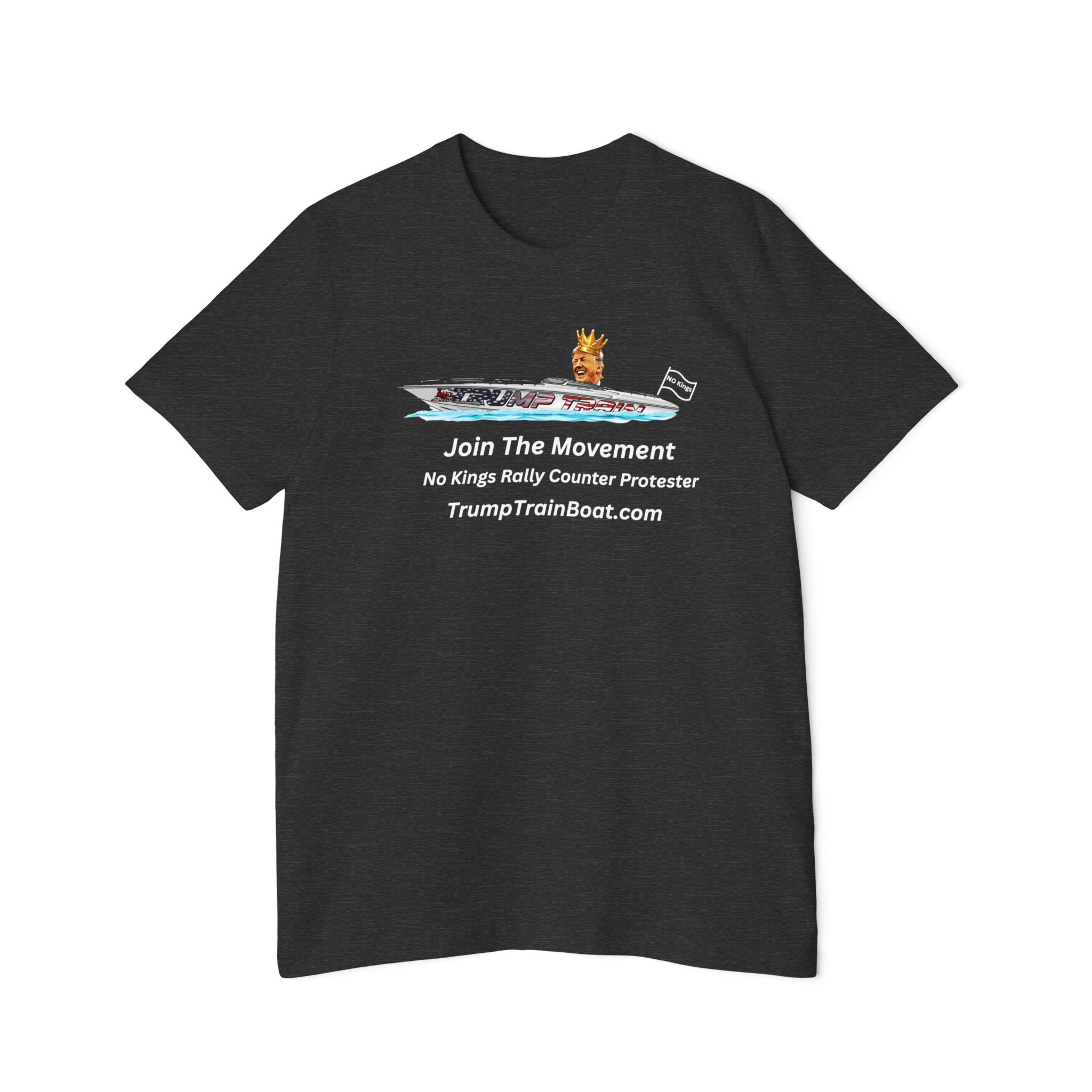 The subtle heather texture gives it that lived-in legend vibe, layering easy under jackets or flying solo when you're ready to drop a calm, confident bombshell. Front and center blasts the hilarious graphic of crowned Trump driving the Trump Train Boat like a royal rebel on a rampage, flashing that mischievous grin while urging all patriots to "Join The Movement!" because nothing says unyielding American grit quite like trolling tyrants from the captain's seat, inspiring you to hop aboard and sail straight through the silliness with First Amendment flair!