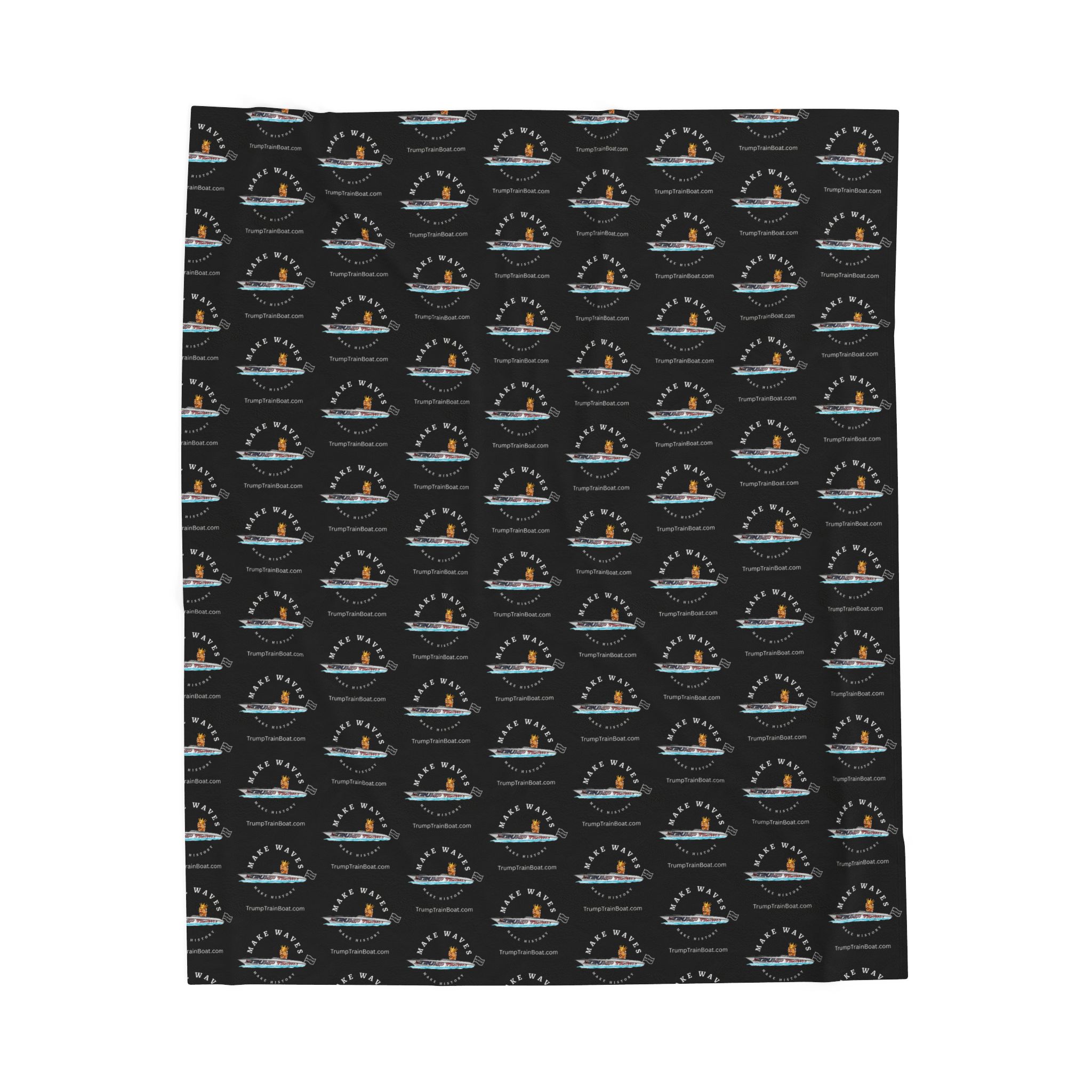 Buckle up, MAGA Faithful. This velvety, medium-weight plush blanket is your ultimate rally-in-a-wrap, printed on one side with a repeating riot of "Make Waves Make History" where a beaming, crowned Trump commands the iconic Trump Train Boat like the undisputed champ of comebacks, hoisting the "No Kings" flag sky-high to troll the tyrants and celebrate true American grit with the swagger only The Donald can deliver.