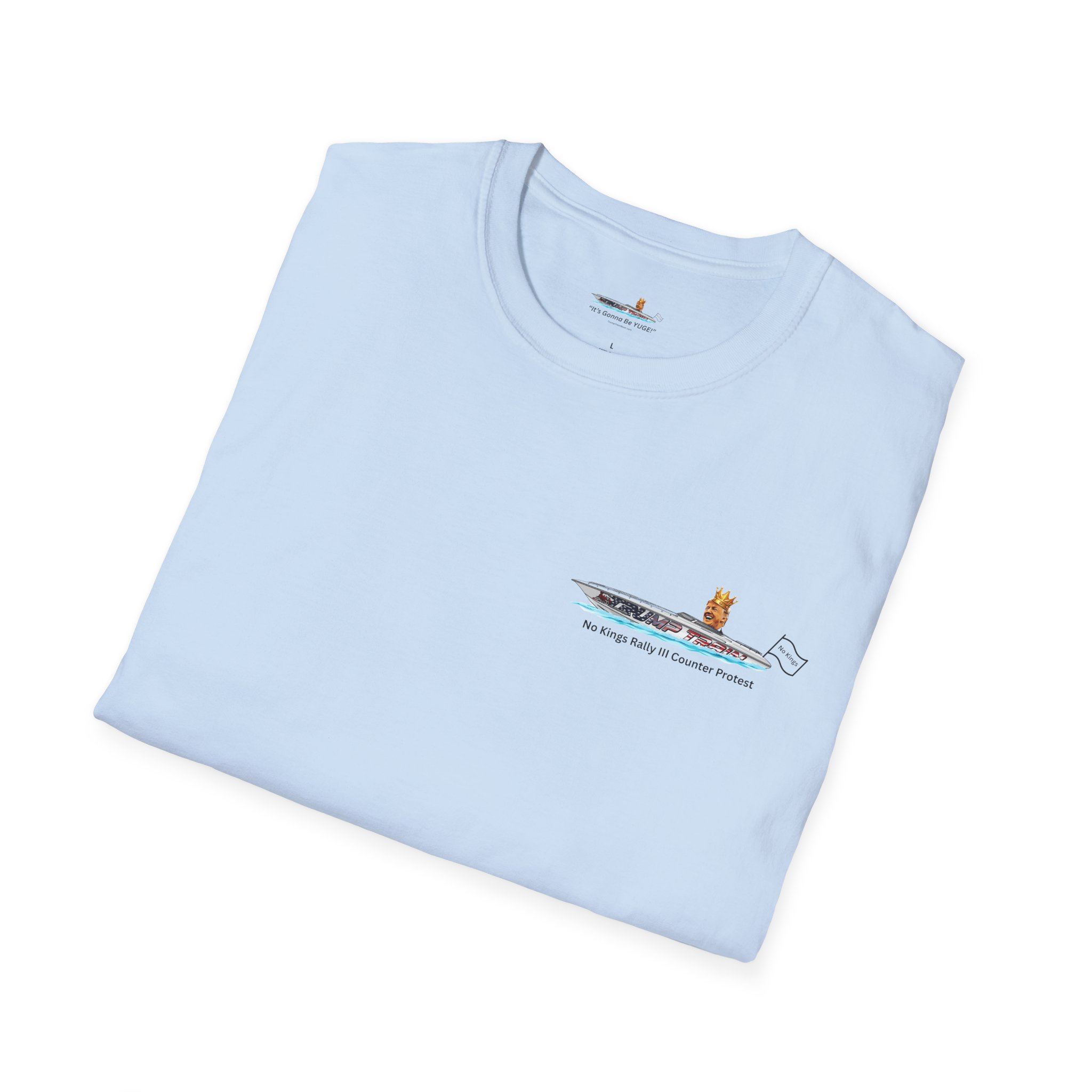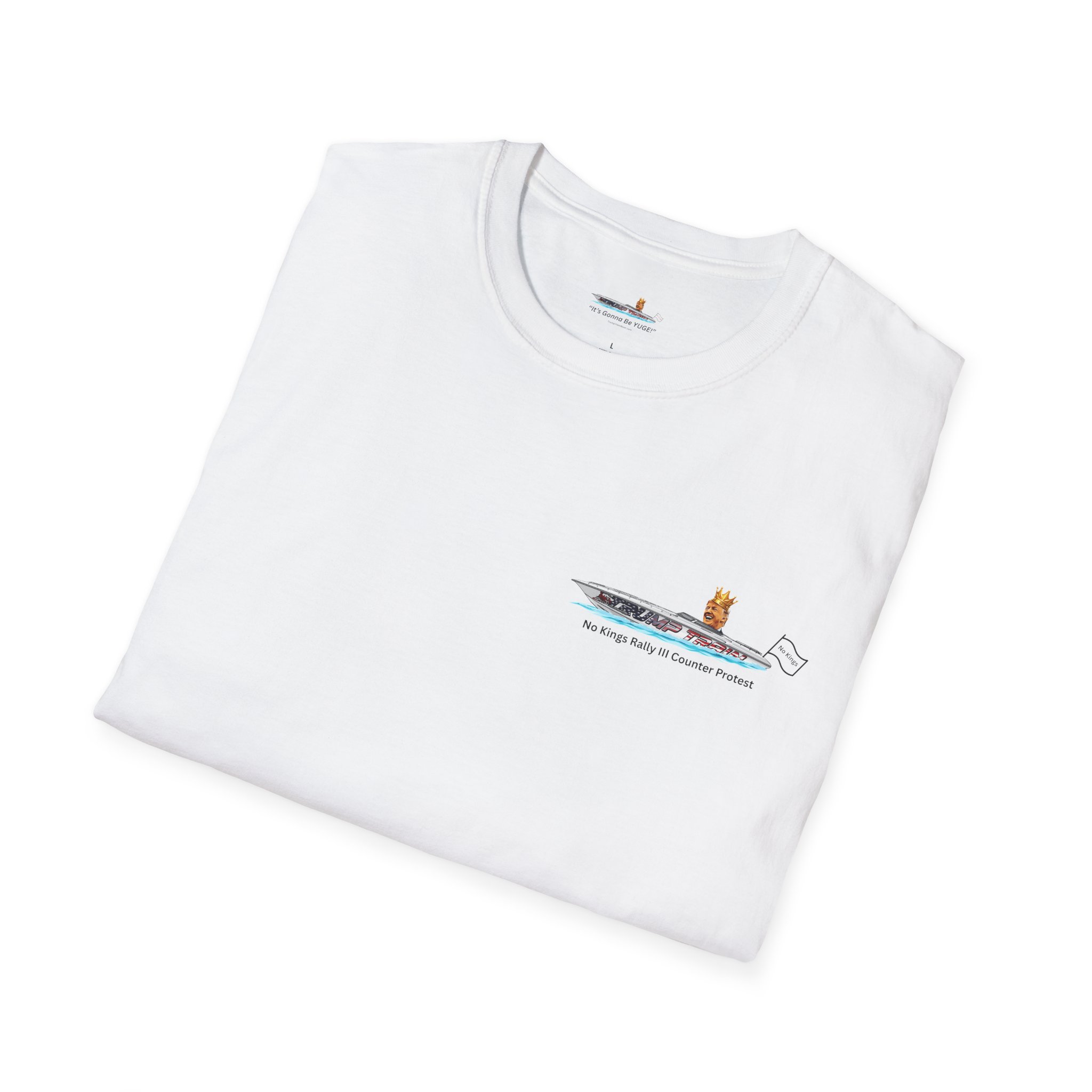 This lightweight cotton tee sneaks in a sly, satirical snapshot of patriotic pandemonium, perfect for those who like their casual wear with a wink and a "hold my beer" vibe. Up front, a tiny pocket-sized masterpiece shows a crowned Trump grinning like he owns the horizon, captaining the legendary Trump Train Boat while proudly flying the "No Kings" flag in the wind.