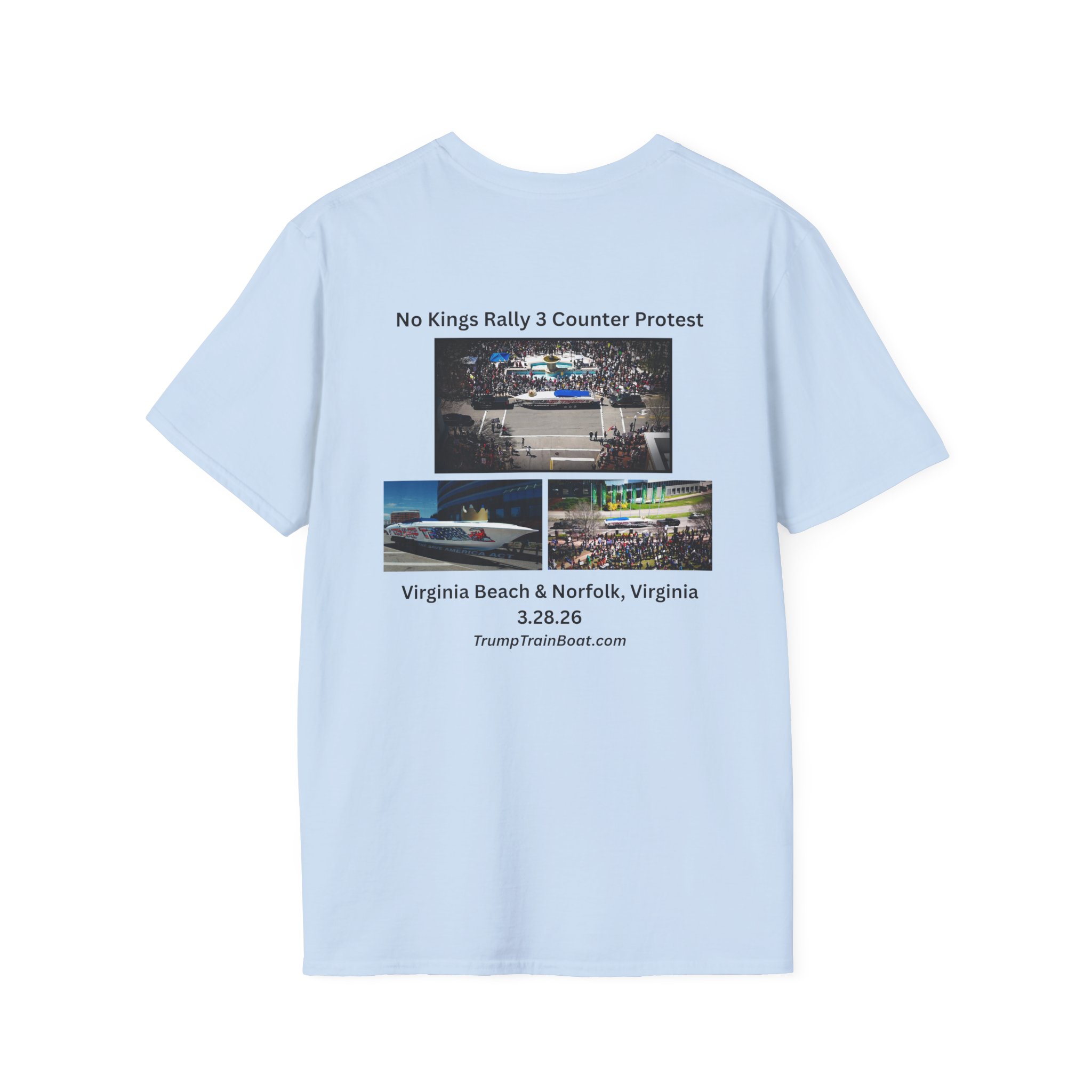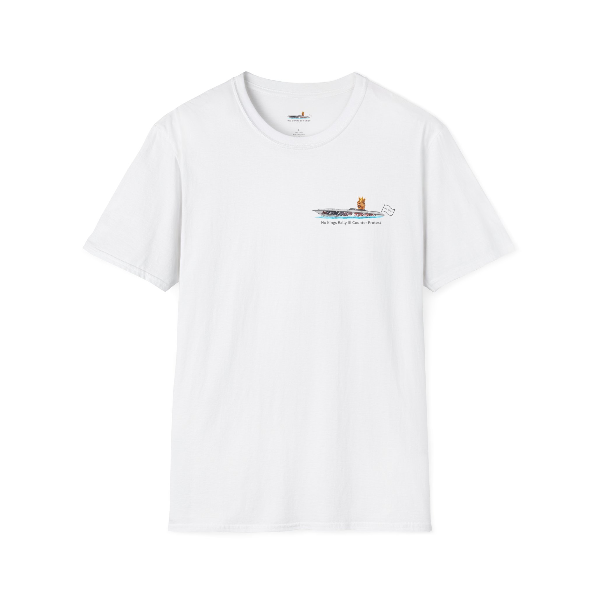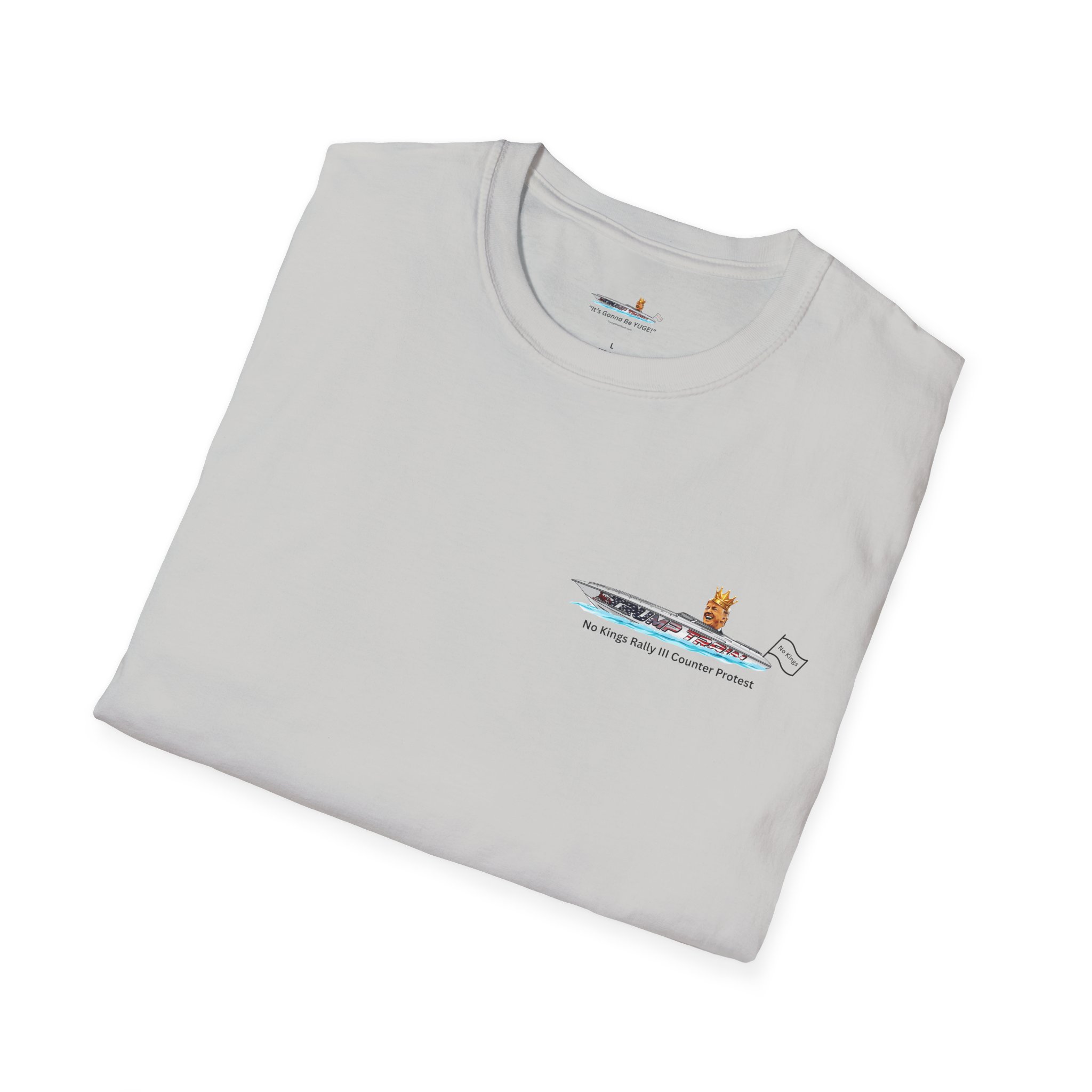 Because why rule like a monarch when you can cruise like a legend? Flip to the back for the view of the Iconic Trump Train boat ready for action. Ready to counter any rally drama with pure, unapologetic First Amendment flair. It's the understated rebel tee that pairs effortlessly with beat-up jeans, layered flannels, or your favorite jacket for fireside hangs or lakeside lounging, soft, breathable, and built to spark smirks without shouting.