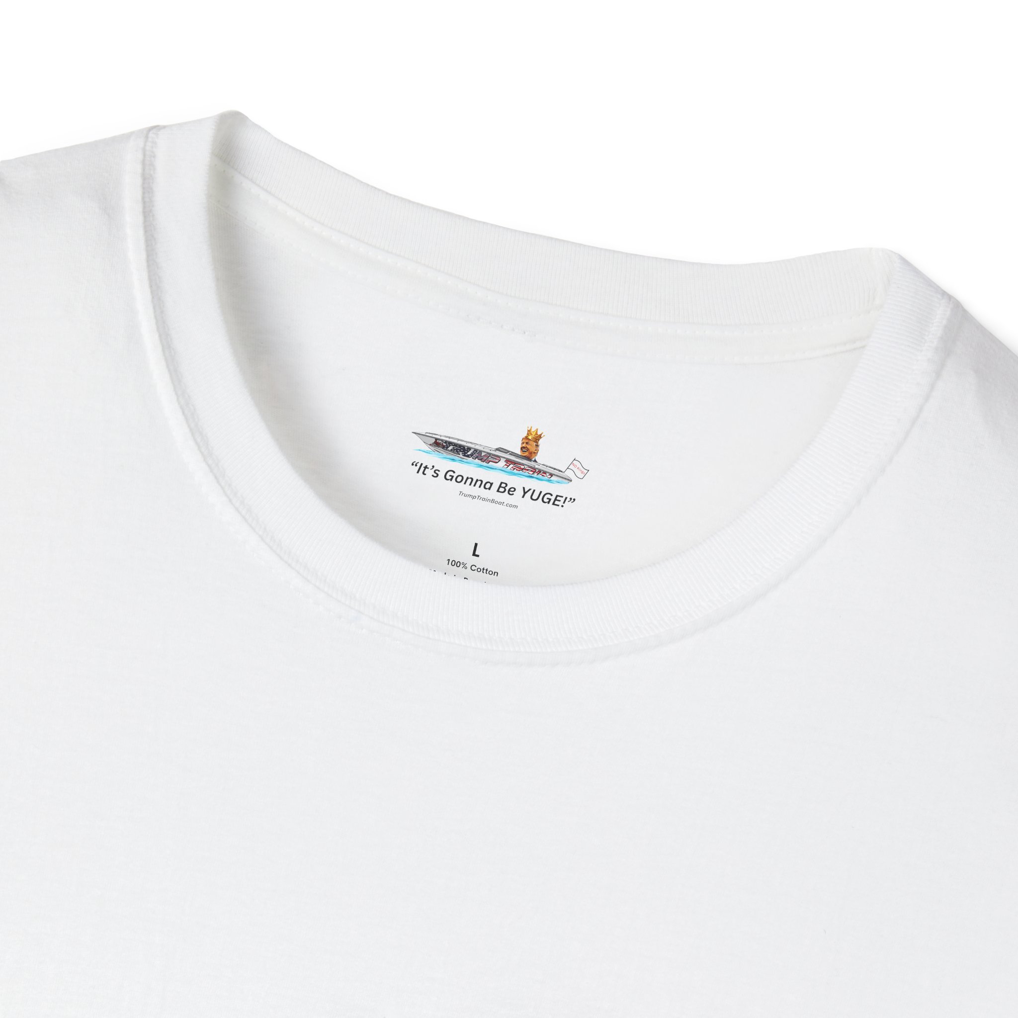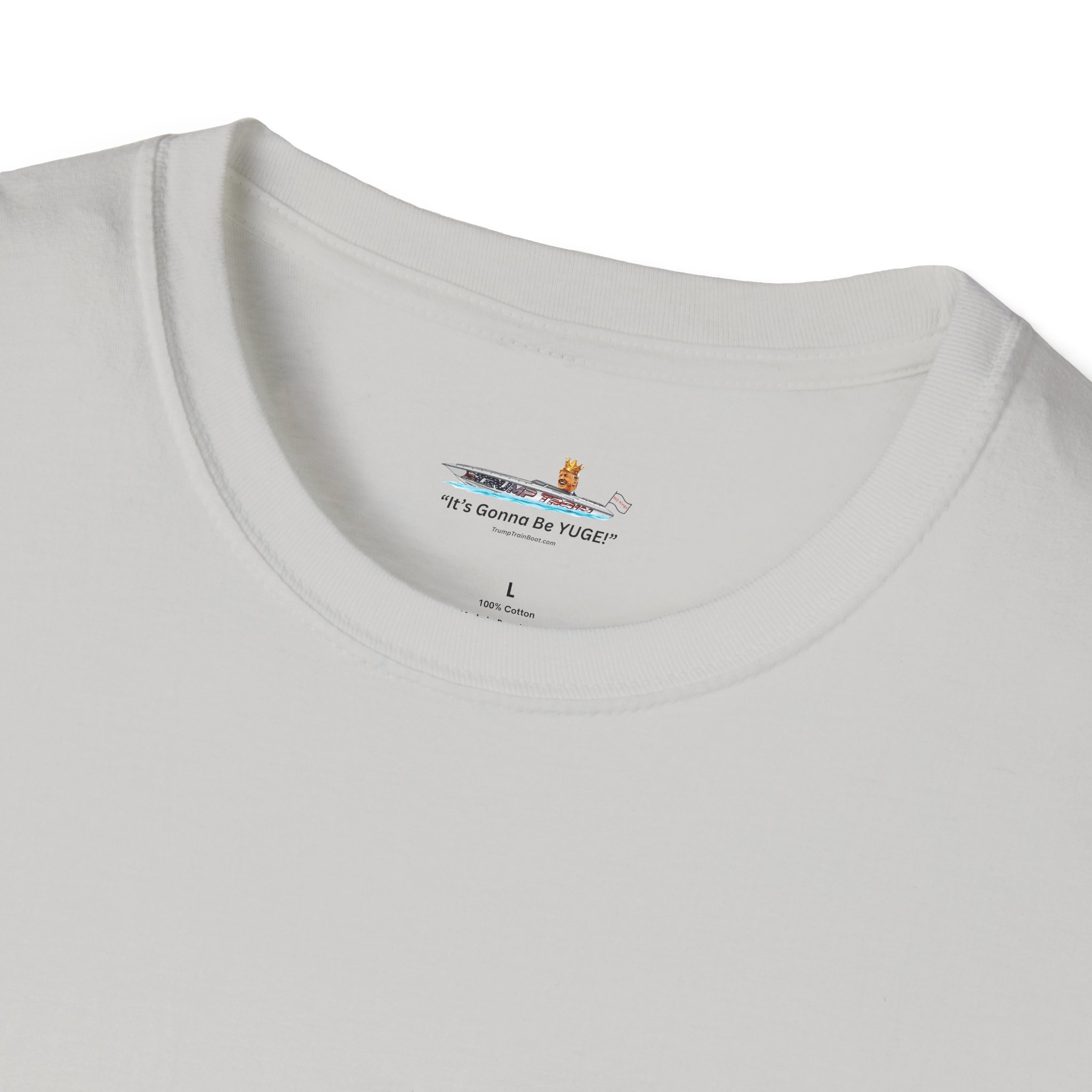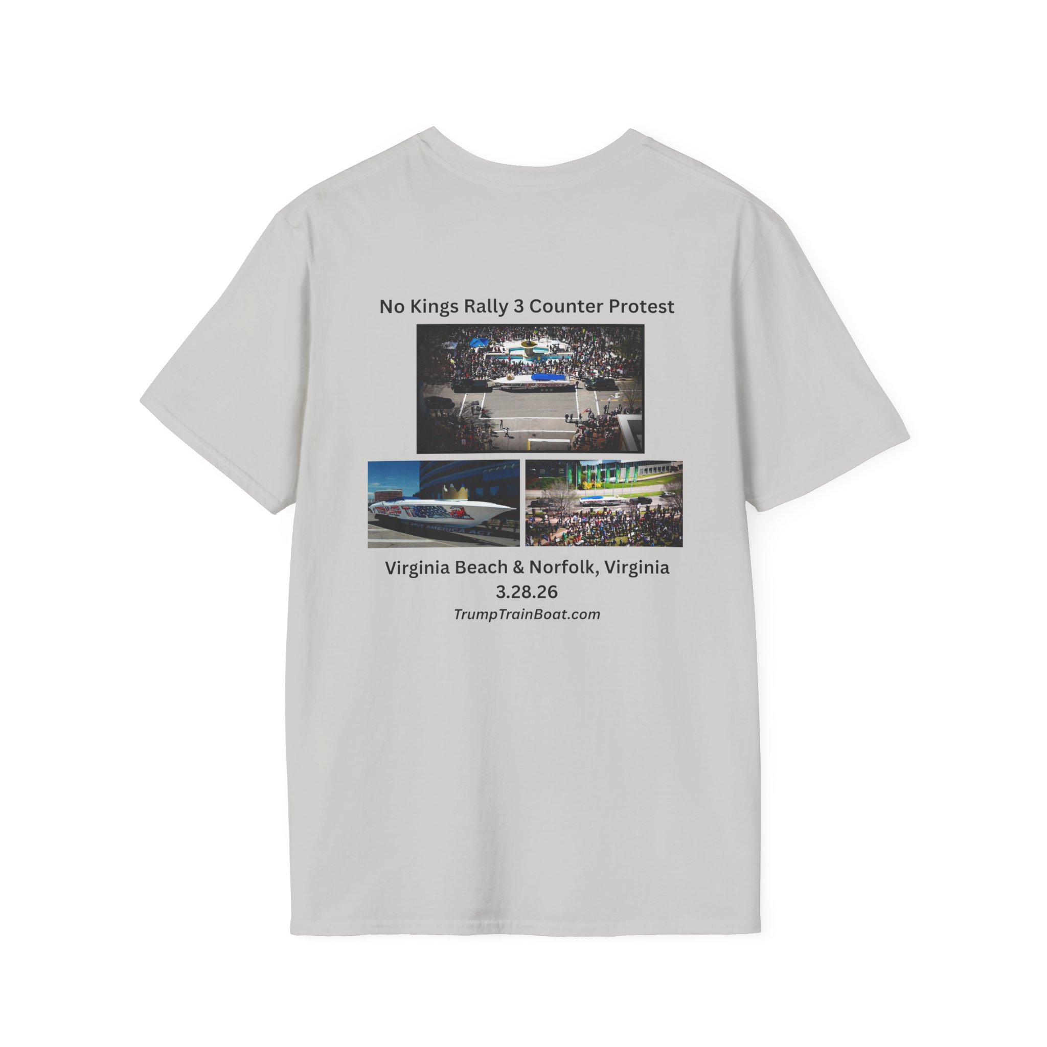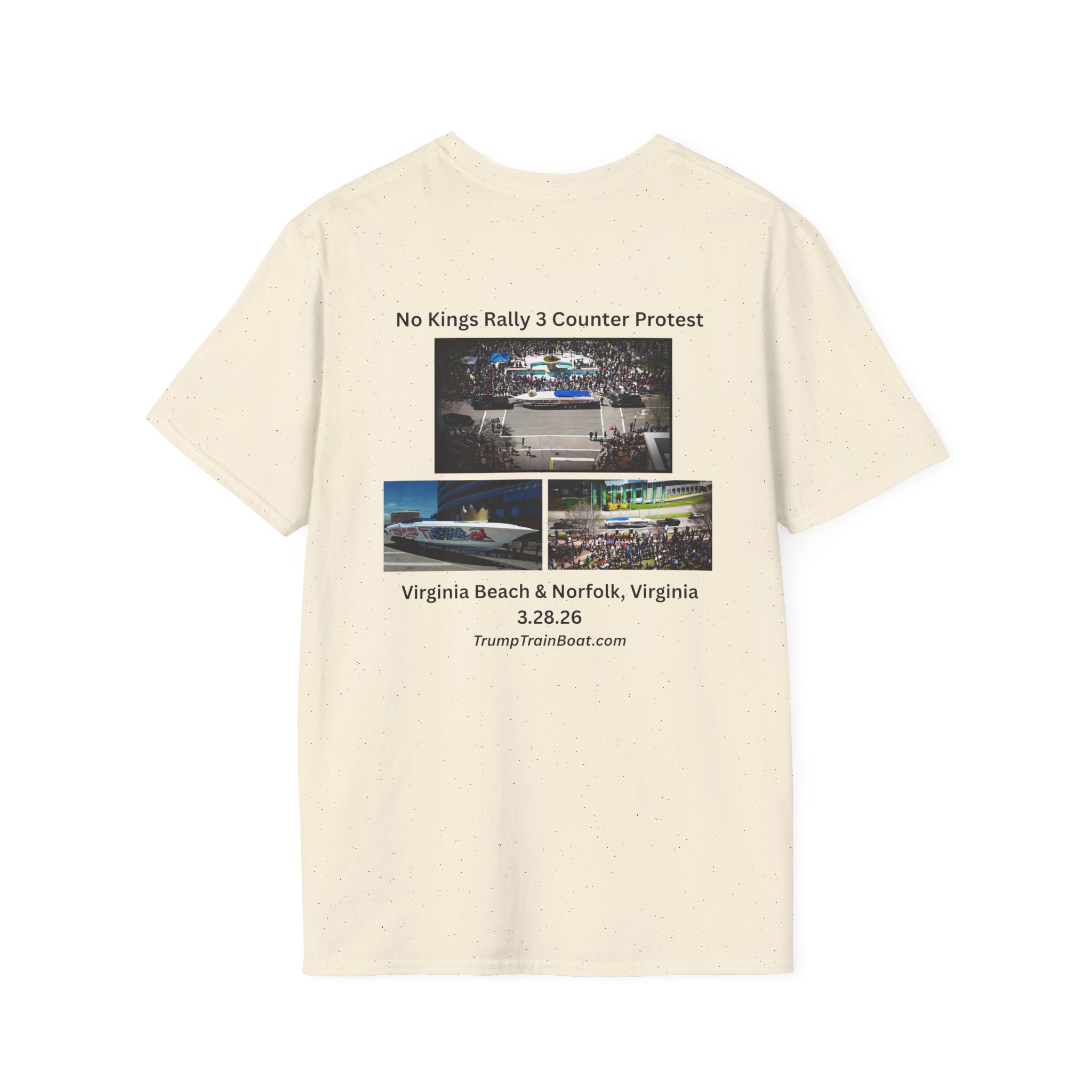 Because why rule like a monarch when you can cruise like a legend? Flip to the back for the view of the Iconic Trump Train boat ready for action. Ready to counter any rally drama with pure, unapologetic First Amendment flair. It's the understated rebel tee that pairs effortlessly with beat-up jeans, layered flannels, or your favorite jacket for fireside hangs or lakeside lounging, soft, breathable, and built to spark smirks without shouting.