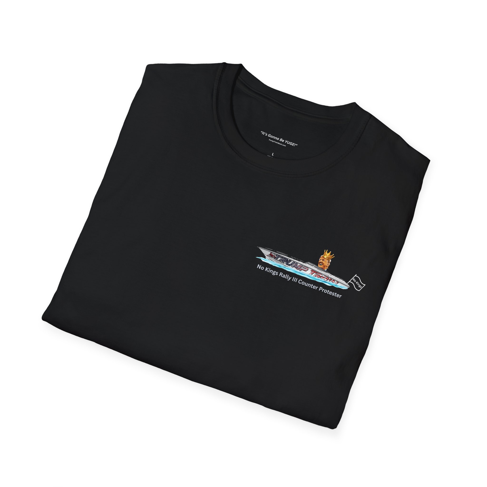 This lightweight cotton tee sneaks in a sly, satirical snapshot of patriotic pandemonium, perfect for those who like their casual wear with a wink and a "hold my beer" vibe. Up front, a tiny pocket-sized masterpiece shows a crowned Trump grinning like he owns the horizon, captaining the legendary Trump Train Boat while proudly flying the "No Kings" flag in the wind.