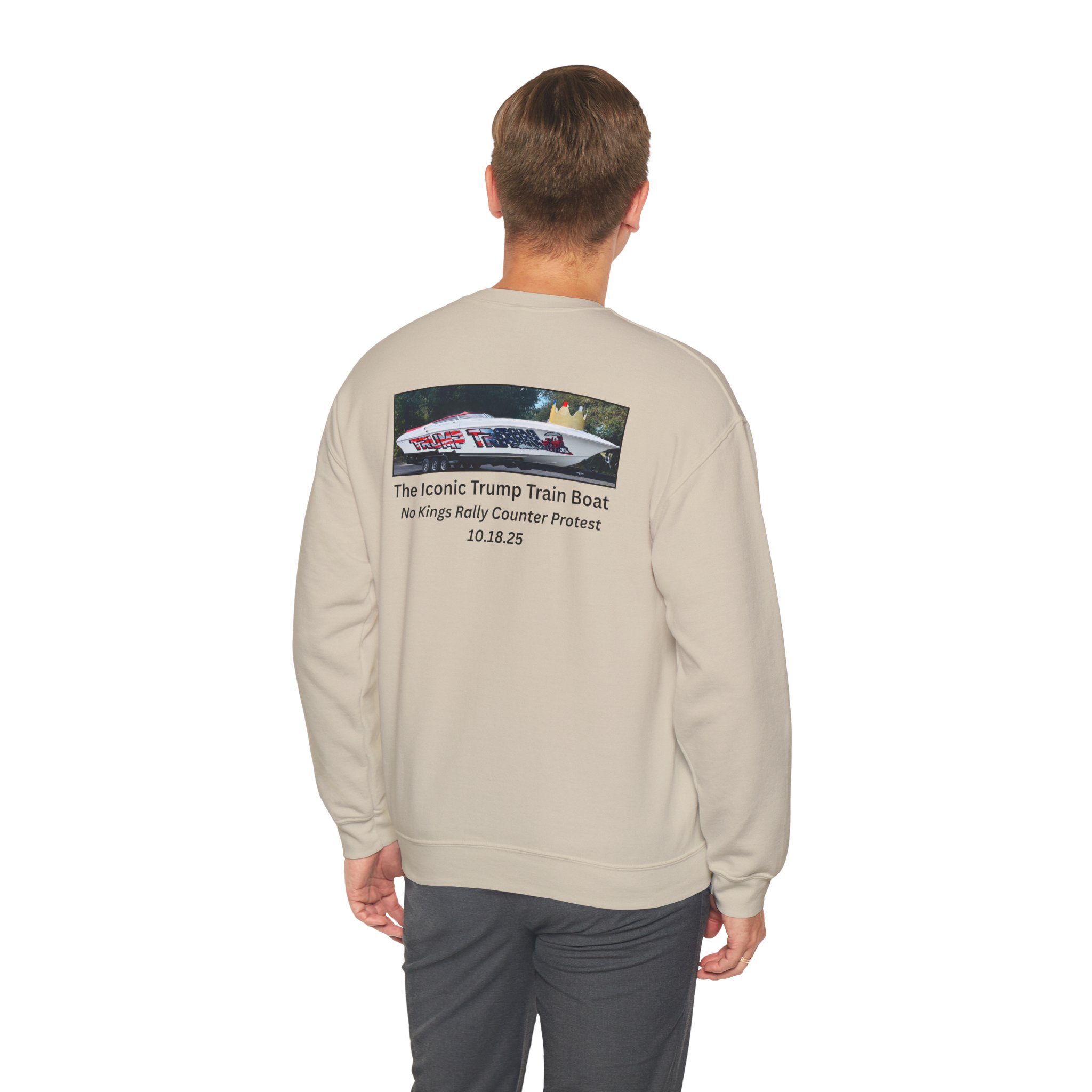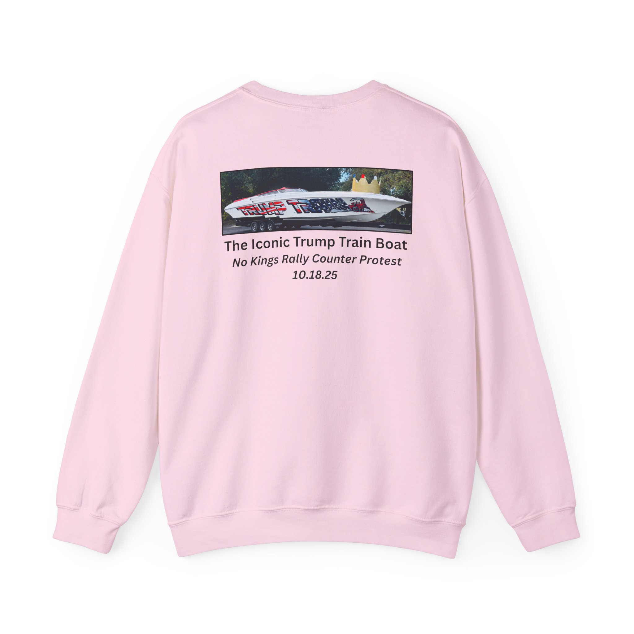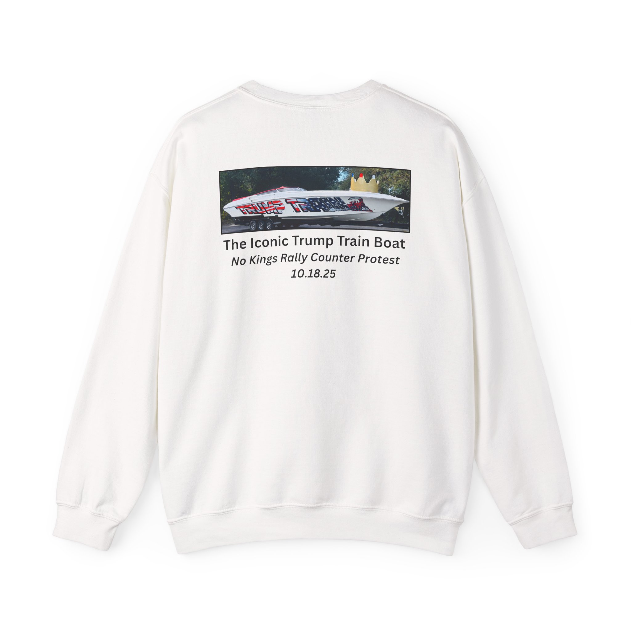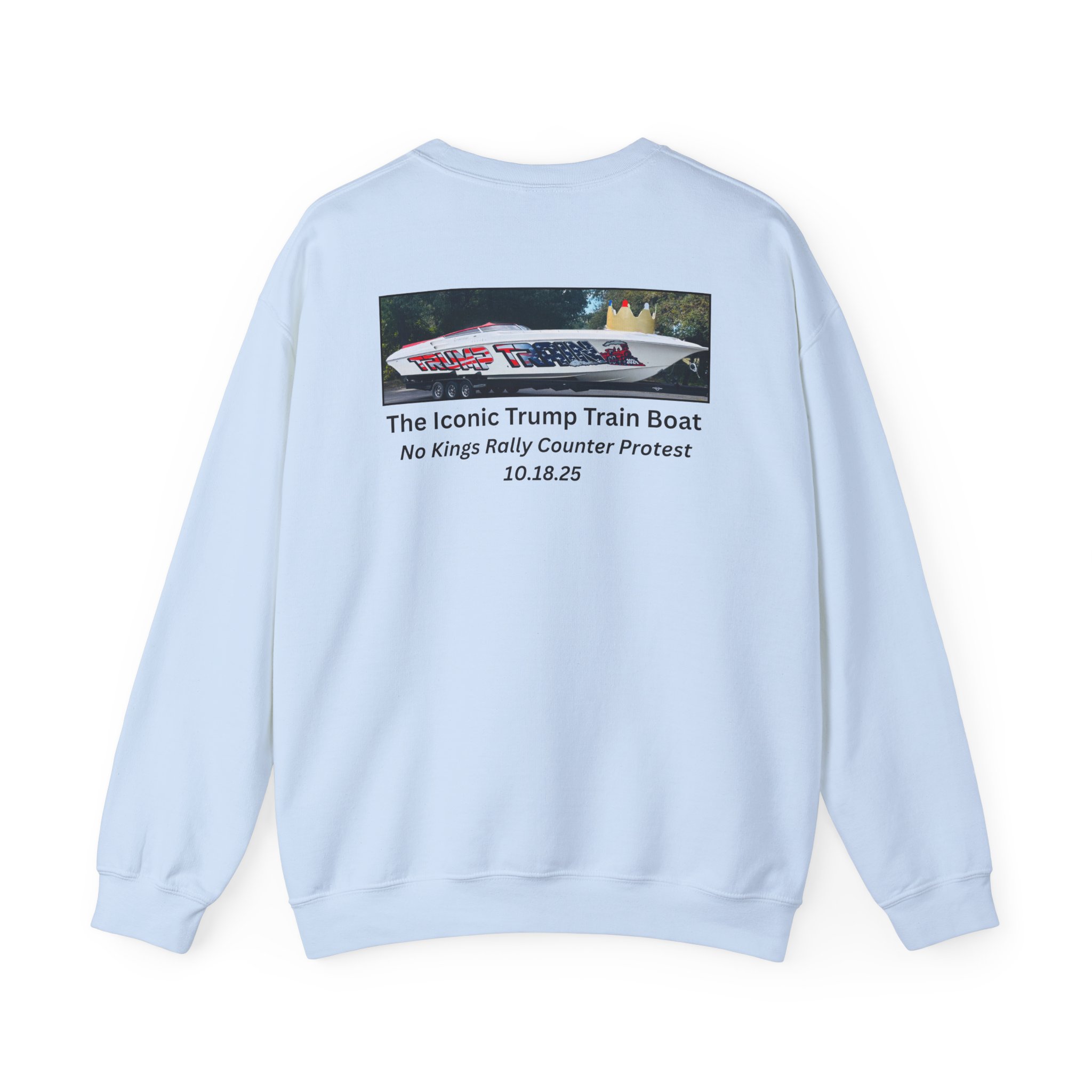 Slip into this soft, mid weight crewneck sweatshirt like you're wrapping yourself in a cozy conspiracy theory. it's got that quiet, documentary vibe that whispers "I was there" without yelling from the rooftops. Up front, a tiny USA emblem plays it cool, but flip to the back for the real showstopper: a printed photo and caption screaming “The Iconic Trump Train Boat — No Kings Rally Counter Protest — 10.18.25,” capturing the boat all prepped, crowned, and revved up moments before crashing the party in Virginia Beach, VA, like a patriotic pirate ship on a mission.