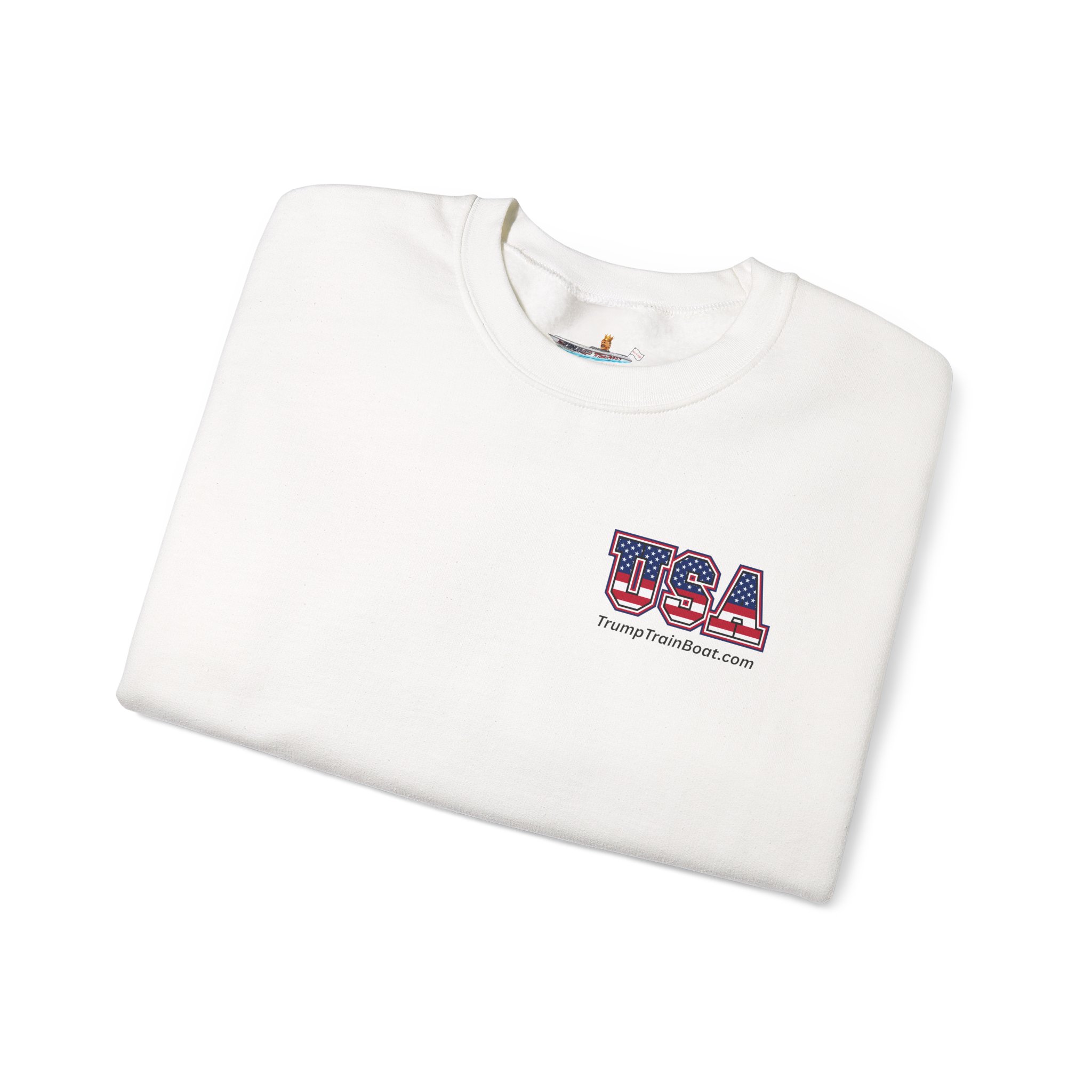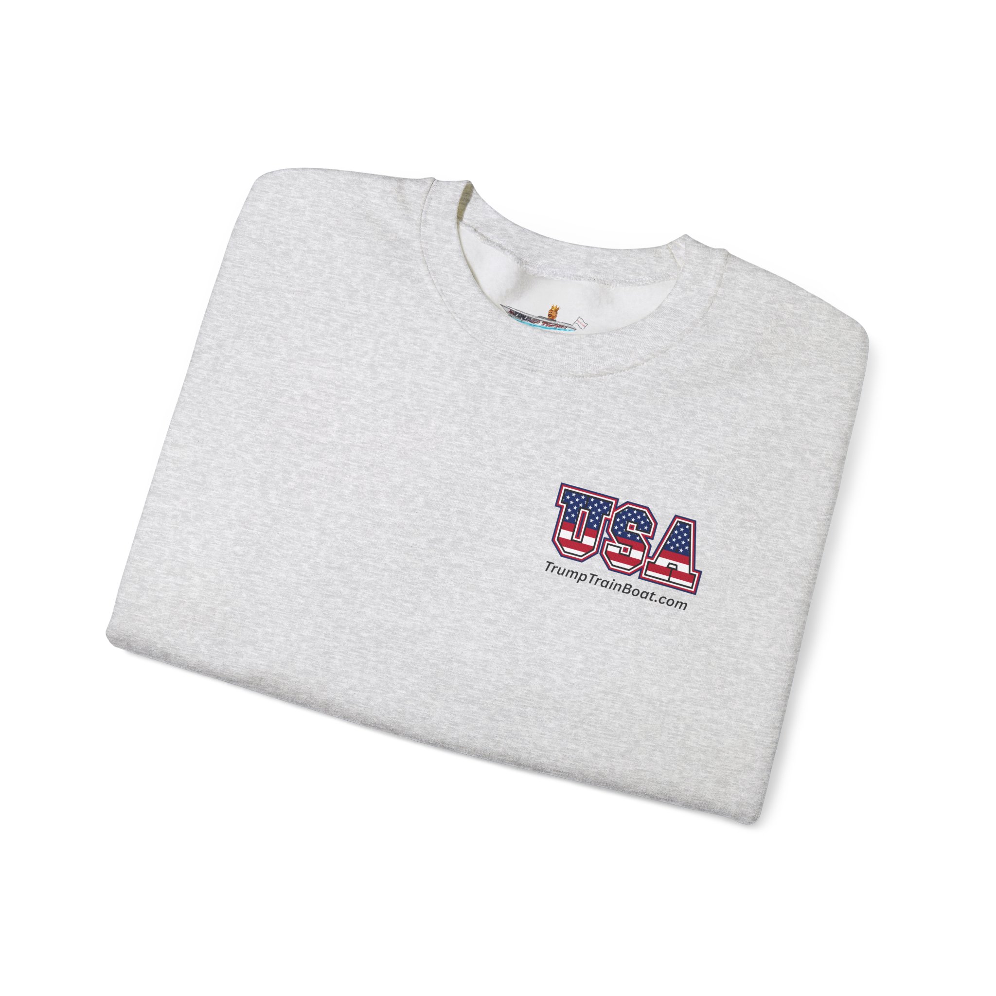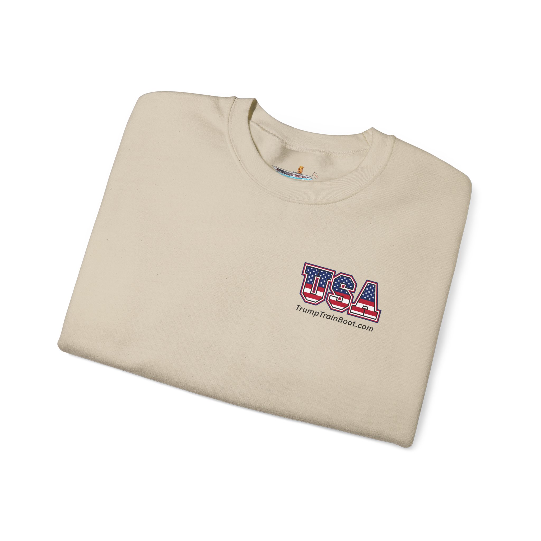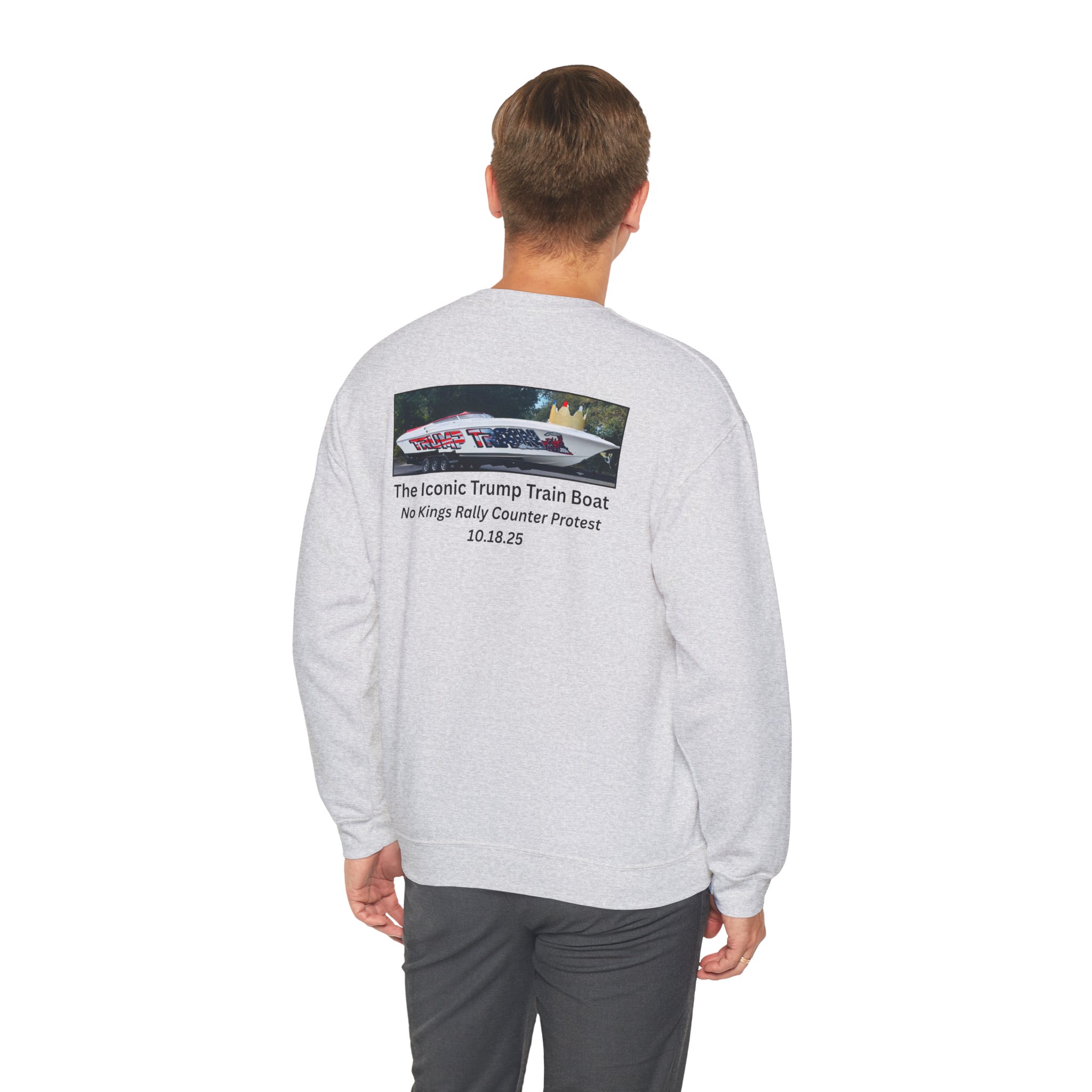 Slip into this soft, mid weight crewneck sweatshirt like you're wrapping yourself in a cozy conspiracy theory. it's got that quiet, documentary vibe that whispers "I was there" without yelling from the rooftops. Up front, a tiny USA emblem plays it cool, but flip to the back for the real showstopper: a printed photo and caption screaming “The Iconic Trump Train Boat — No Kings Rally Counter Protest — 10.18.25,” capturing the boat all prepped, crowned, and revved up moments before crashing the party in Virginia Beach, VA, like a patriotic pirate ship on a mission.
