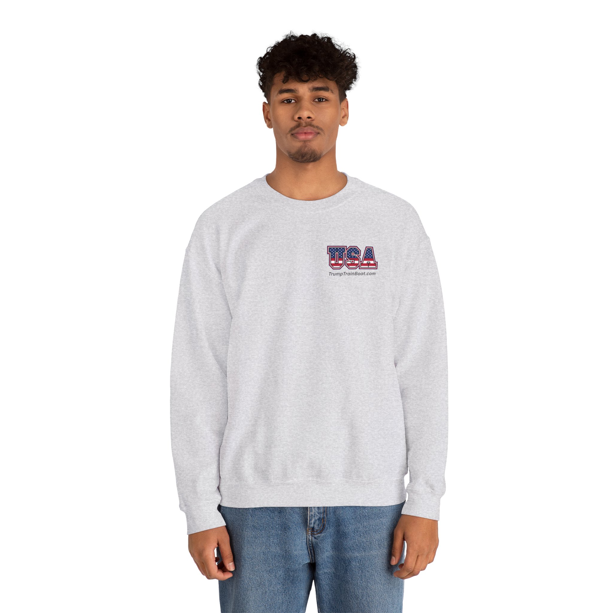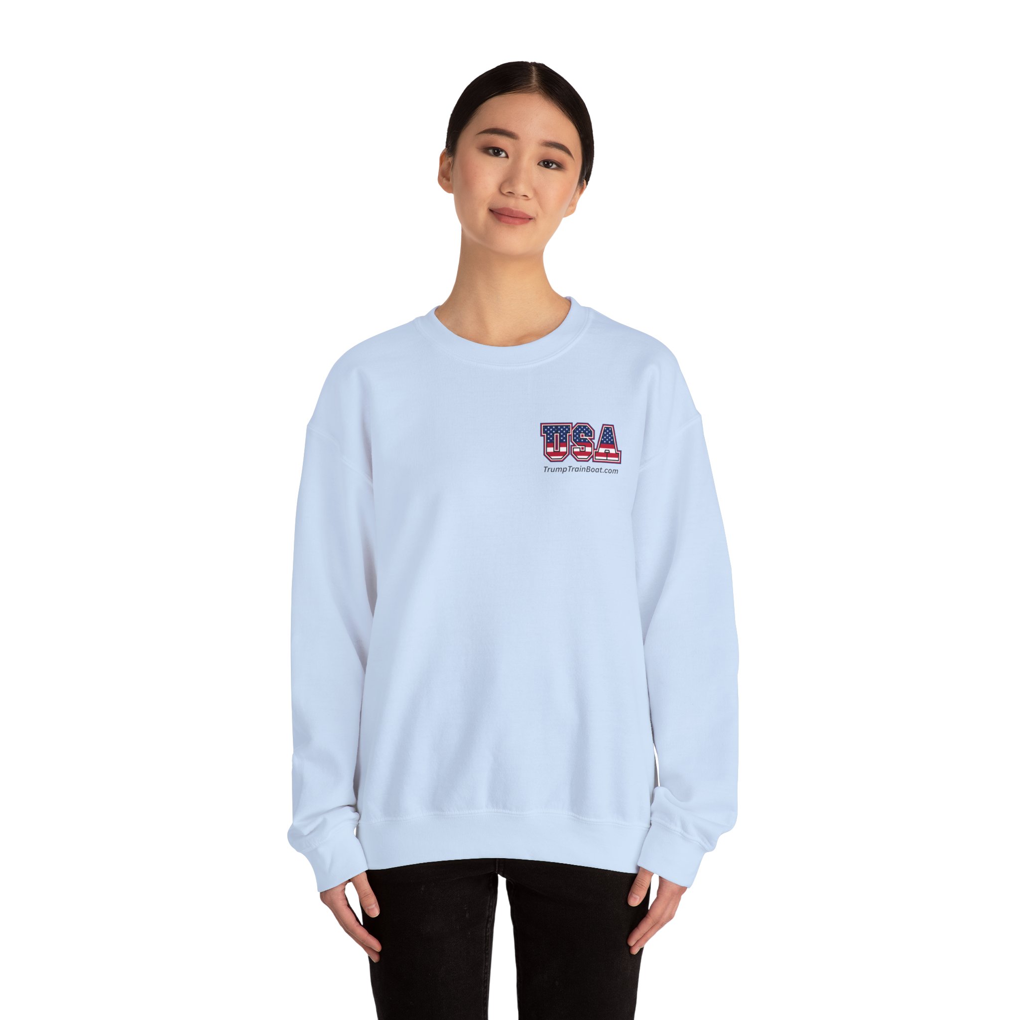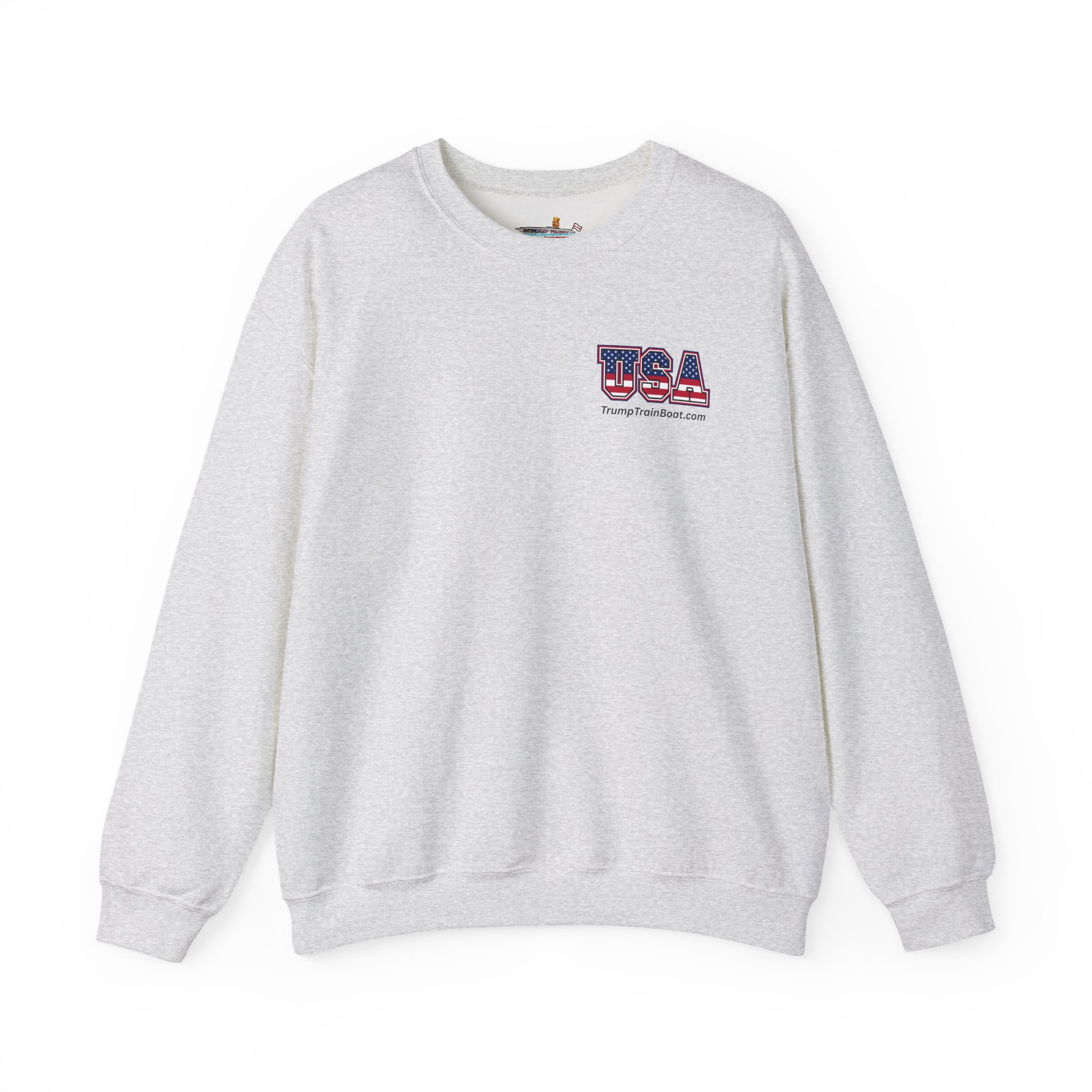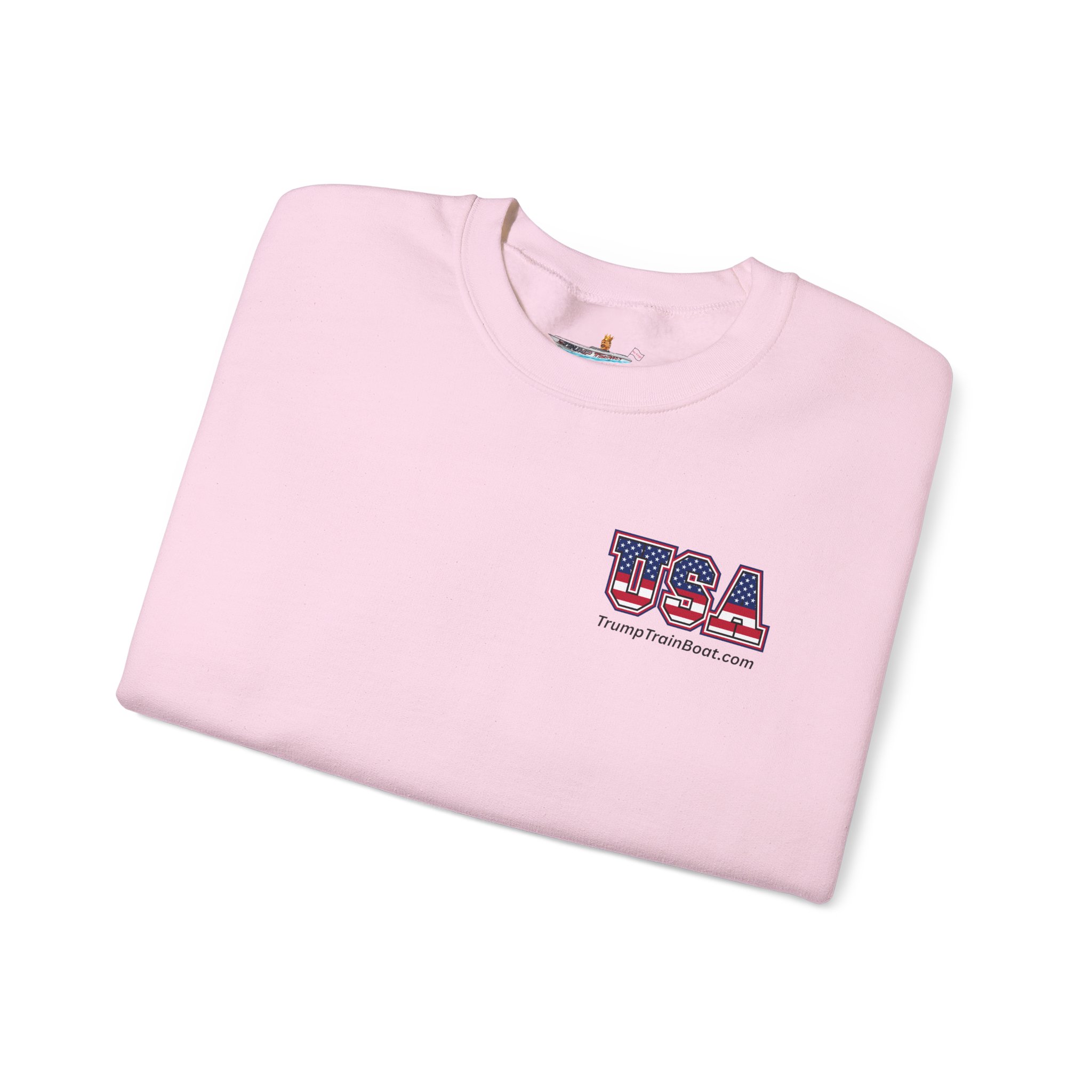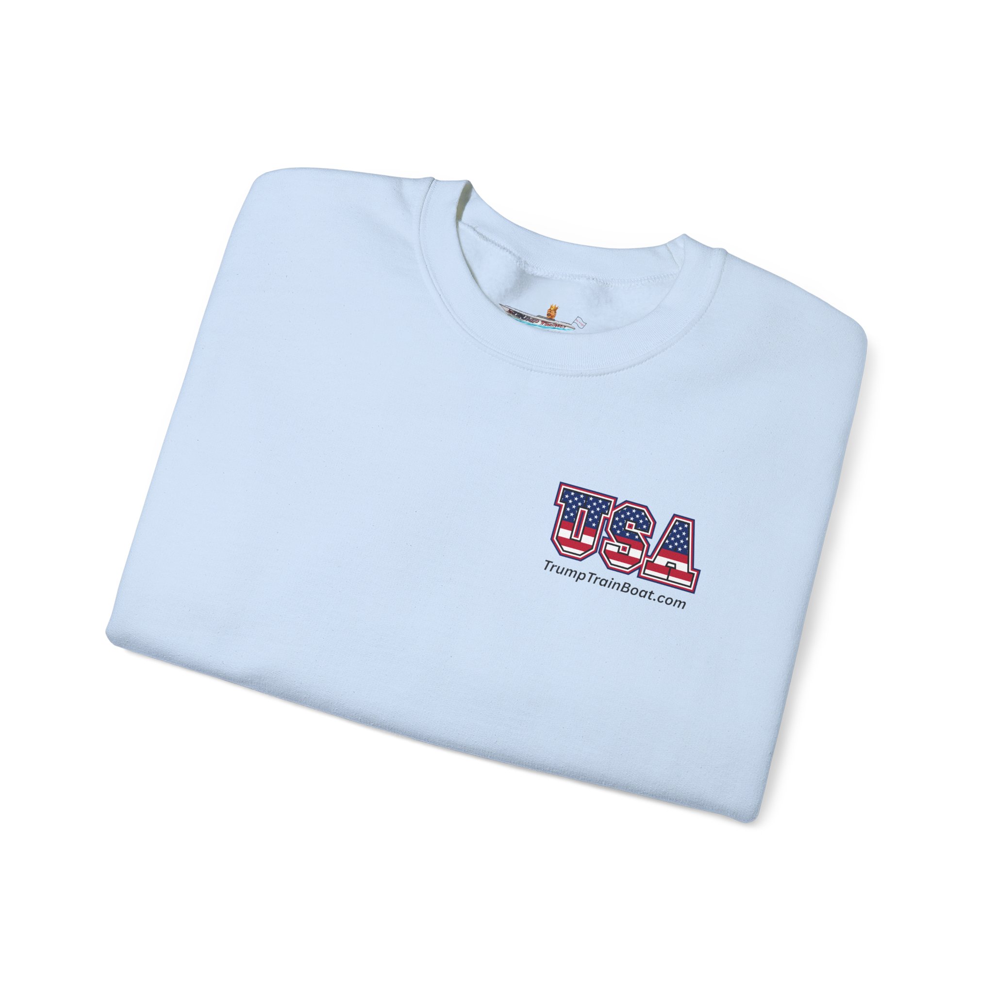 Slip into this soft, mid weight crewneck sweatshirt like you're wrapping yourself in a cozy conspiracy theory. it's got that quiet, documentary vibe that whispers "I was there" without yelling from the rooftops. Up front, a tiny USA emblem plays it cool, but flip to the back for the real showstopper: a printed photo and caption screaming “The Iconic Trump Train Boat — No Kings Rally Counter Protest — 10.18.25,” capturing the boat all prepped, crowned, and revved up moments before crashing the party in Virginia Beach, VA, like a patriotic pirate ship on a mission.