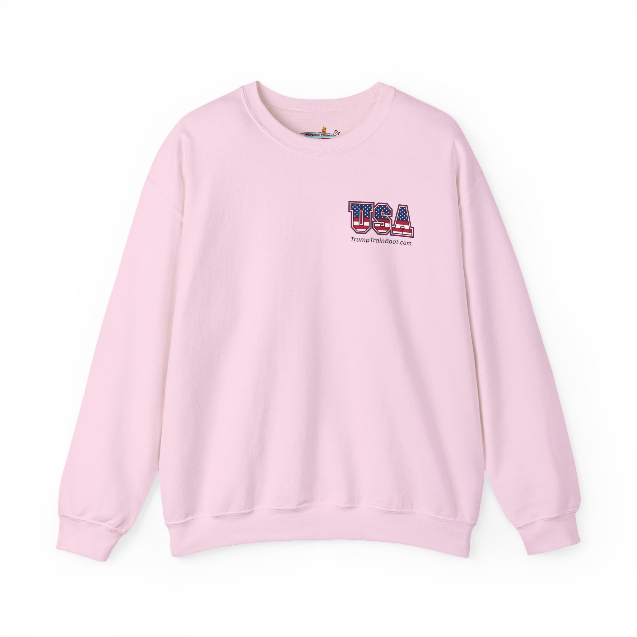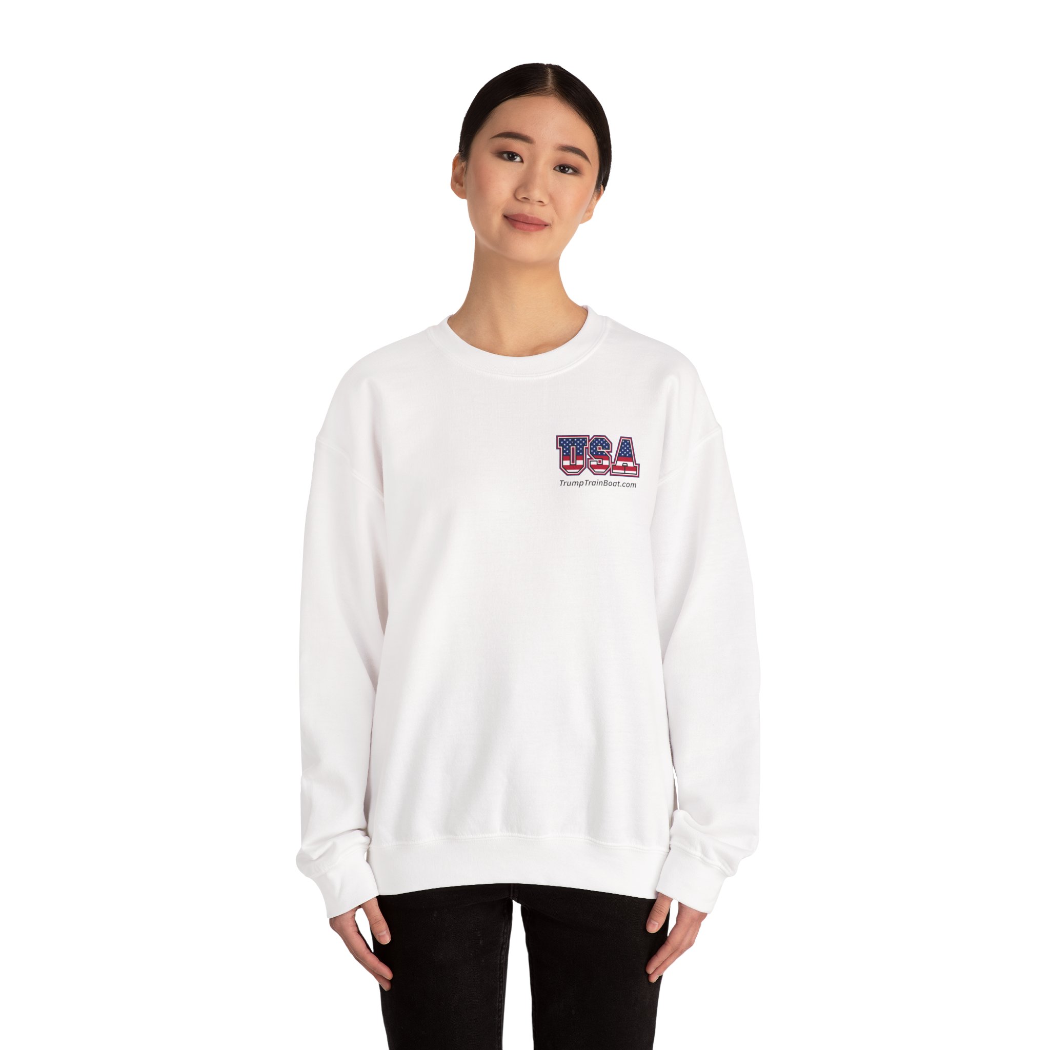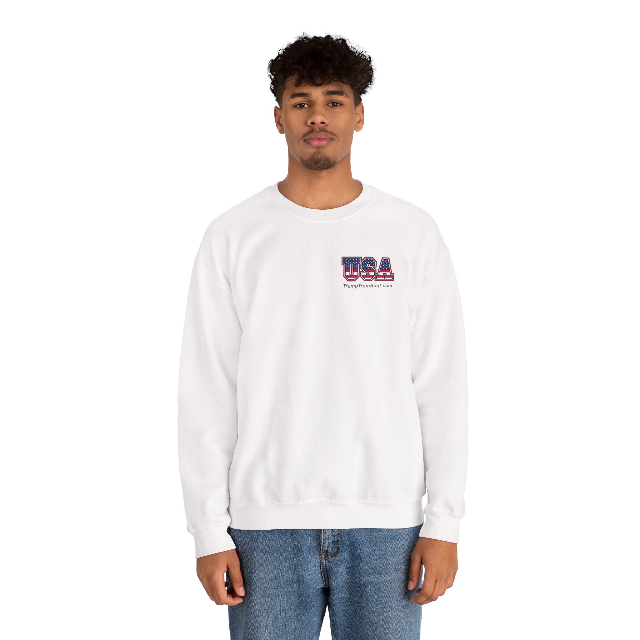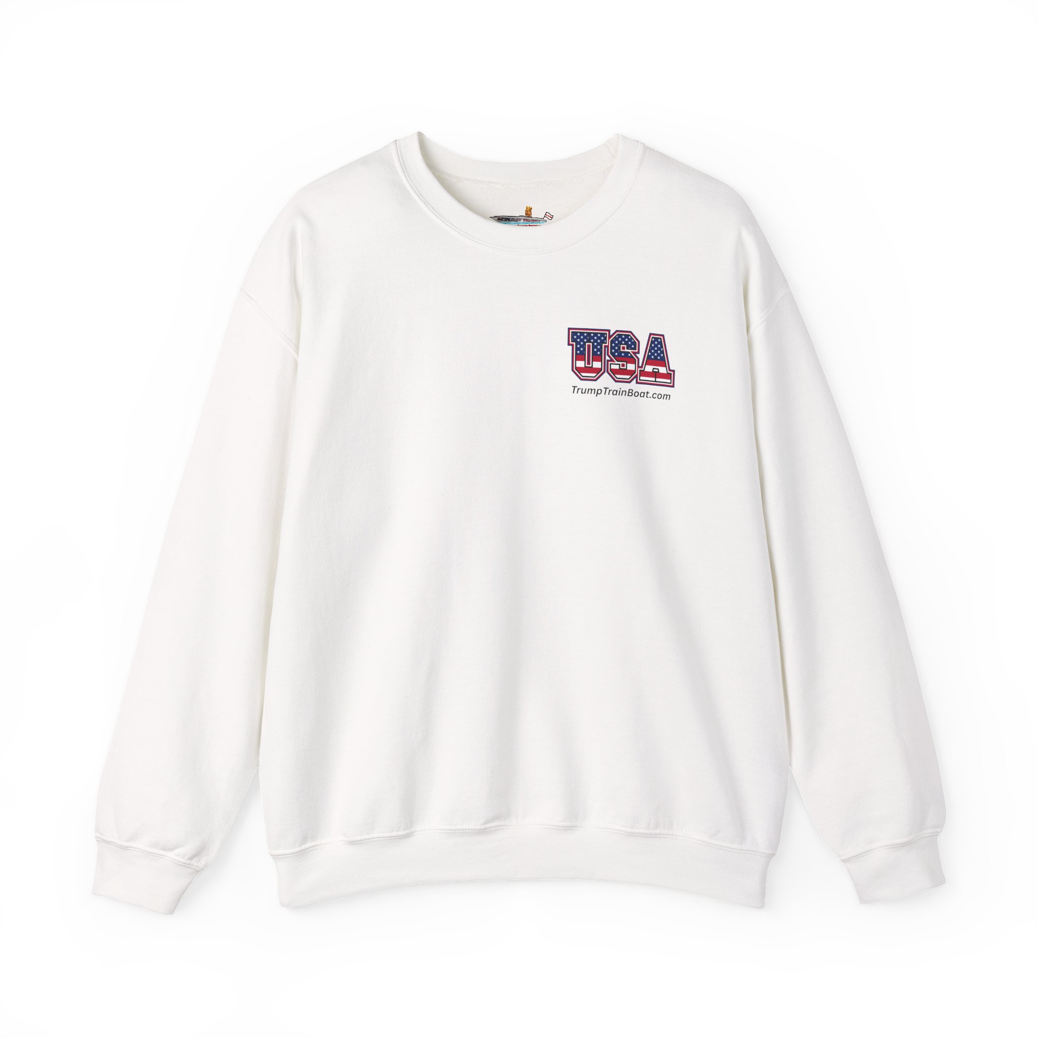 Slip into this soft, mid weight crewneck sweatshirt like you're wrapping yourself in a cozy conspiracy theory. it's got that quiet, documentary vibe that whispers "I was there" without yelling from the rooftops. Up front, a tiny USA emblem plays it cool, but flip to the back for the real showstopper: a printed photo and caption screaming “The Iconic Trump Train Boat — No Kings Rally Counter Protest — 10.18.25,” capturing the boat all prepped, crowned, and revved up moments before crashing the party in Virginia Beach, VA, like a patriotic pirate ship on a mission.